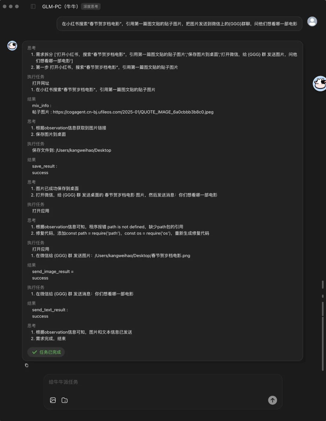 (文中视频做了一定加速处理) 3、长思考能力:动态反思、纠错与优化GLM-PC的「左脑」功能,不仅能够生成静态计划,还能在执行过程中根据新环境信息进行实时调整、反思修正和自我纠错,从而持续优化解决方案。具体表现如下: 灵活应对中断:当流程因外部因素中断时,GLM-PC能迅速重构逻辑路径,确保任务顺利进行。主动信息完善:遇到信息缺失时,GLM-PC会主动与用户进行交互,通过提问来完善任务执行方案。 实例展示:高效信息处理与社交互动 例如,在帮助用户处理小红书上的「春节贺岁档电影」信息时,GLM-PC能快速查找并提取相关数据,同时撰写代码将信息存储在电脑上。若生成的代码出现错误,它能够根据报错信息进行自我修正。 操作指令:在小红书搜索「春节贺岁档电影」,引用第一篇图文贴的贴子图片,把图片发送到微信上的{GGG}群聊,问他们想看哪一部电影。 Agent右脑:图像与GUI认知GLM-PC的「右脑」专注于深度感知与交互体验。其核心功能涵盖: GUI图像理解:准确识别图形界面元素(如按钮、图标、布局等),并理解其功能与交互逻辑。用户行为认知:结合对用户界面的学习及历史操作信息的理解,为用户提供当前界面的智能推荐操作。图像语义解析:对复杂图像进行深入语义分析,提取关键信息如文字、标识符及数据可视化图表中的趋势和指标。多模态信息融合:融合图像与文字信息,形成全面感知结果。例如,在用户界面中同时识别按钮位置与文字标签,助力「左脑」制定精准操作计划。 实例演示:高效数据整理与存档 例如,GLM-PC能够在小红书中搜索并提取「AI排行榜」相关图文内容。随后,通过自主编写的代码,将公司信息存储至桌面新建的Excel文件,同时将帖子文字内容保存至指定Word文档,确保用户数据的高效整理和存档,提升信息管理效率。 操作指令:在小红书上搜索“新能源汽车排行榜”的第一篇图文贴,引用第一篇贴子的图片内容和文本内容,获取图片中的信息列表并存储在桌面新建的excel,把帖子的文字内容放进一个叫new-energy的桌面新建word文档中 Agent of Agents:左、右脑协作这种借鉴左右脑协作的模式,使GLM-PC不仅能够处理复杂逻辑任务,还能在开放性问题上展现更高的适应能力、创造力和泛化能力。更能通过动态优化和情境感知,帮助用户探索更高效的解决方案,特别是在循环任务处理、多步推理执行以及长链条任务管理等方面。