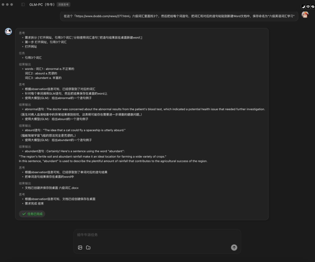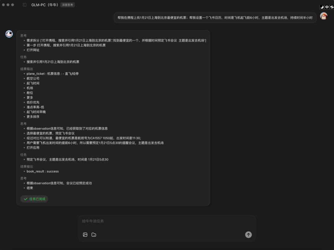 实例展示:六级英语词汇学习辅助 GLM-PC作为六级英语词汇学习助理,能够从指定网站自动提取六级词汇,根据这些词进行造句,并将词汇及其造句自动保存至新建Word文档,文档命名为「六级英语词汇学习」。 在这个「https://www.dxsbb.com/news/277.html」六级词汇里面找3个,然后把给每个词造句,把词汇和对应的造句粘贴到新建Word文档中,保存命名为「六级英语词汇学习" 实例展示:个性化微信祝福语与新春祝贺图片群发 GLM-PC 能够自动为微信群好友定制个性化新春祝福语及祝贺图片/视频,并通过一键操作实现群发,高效完成节日问候。 操作指令:在微信上引用「GGG」群成员列表,给每个人发送2025新春祝福语和一张蛇年主题图片 实例展示:智能航班查询与日程安排 GLM-PC 能为用户快速查询航班信息,筛选最经济机票,并同步设置飞书日历提醒,实现航班查询、购票筛选到日程安排的一站式服务。 操作指令:帮我在携程上找1月21日上海到北京最便宜的机票;帮我设置一个飞书日历,时间是飞机起飞前6小时,主题是出发去机场,持续时间半小时