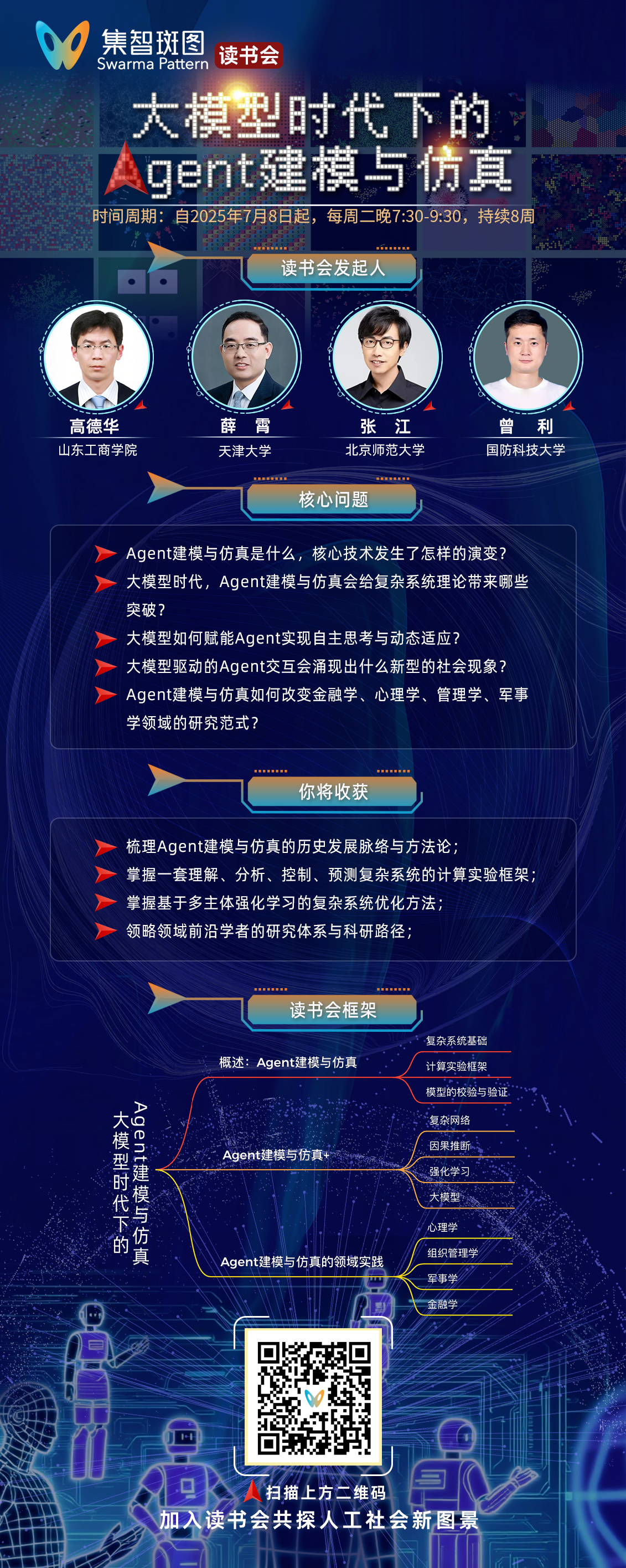因此,集智俱乐部联合山东工商学院副教授高德华、天津大学教授薛霄、北京师范大学教授张江、国防科技大学博士研究生曾利共同发起「大模型时代下的Agent建模与仿真」读书会。读书会自2025年7月8日开始,每周二晚上7:30-9:30进行,预计持续分享8周左右。扫码加入Agent建模与仿真的前沿探索之旅,一起共学、共创、共建、共享「大模型时代下的Agent建模与仿真」社区,共同畅想大模型时代人工社会的未来图景!