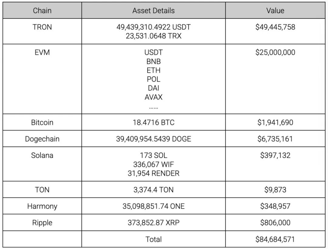 慢雾(SlowMist) 进一步确认,事件中受影响资产涵盖 TRON、EVM 及 BTC 网络,初步估算损失约为 8,170 万美元。