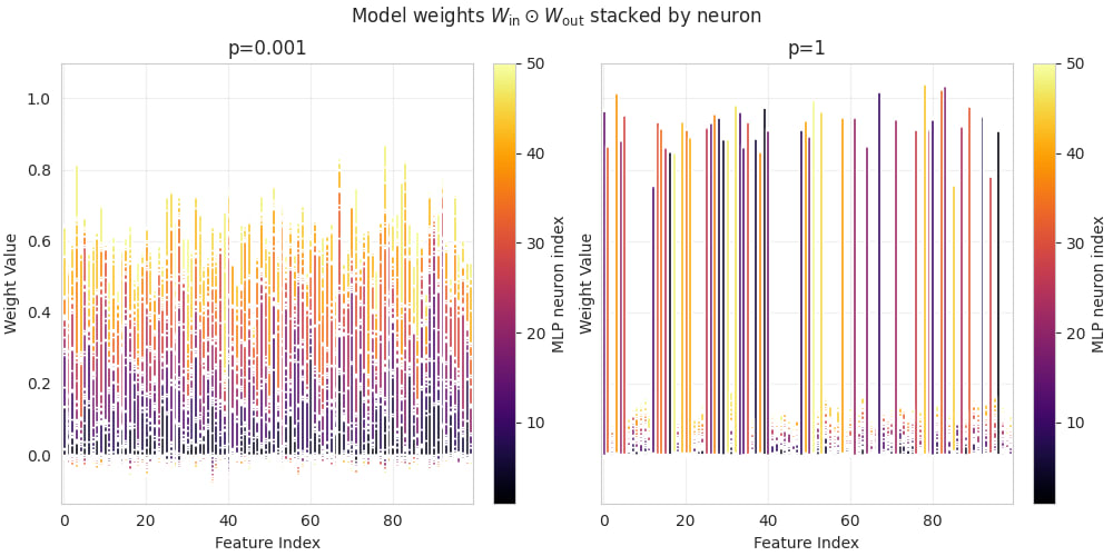 - In the sparse regime (low probability ) we find solutions that perform well on sparse inputs, and less well on dense inputs. They typically exhibit a similar input-output response for all features (Figure 3a), and weights distributed across all features (Figure 4a, equivalent to Figure 6 in Braun et al. 2025). The maximally sparse case (exactly one input active) behaves very similar to .In the dense regime (high probability ) we find solutions with a constant per-feature loss on sparse inputs, but a better performance on dense inputs. These solutions tend to implement half the input features with a single neuron each, while ignoring the other half (Figures 3b and 4b).
