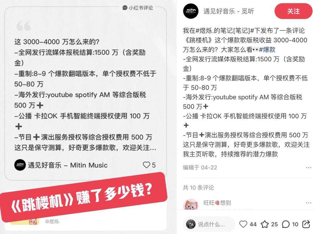 坊间流传,《跳楼机》这个爆款歌版税收益已经高达3000-4000万,如果加上这首歌带给LBI利比作为艺人身份的加持,实际收益当然远不止这个数字。根据小红书博主“遇见好音乐-觅听”的分享,3000-4000万是由全网发行流媒体版税结算、8-9个爆款翻唱、海外发行、公播、综艺节目以及演出服务授权等各项收入累积起来的金额。