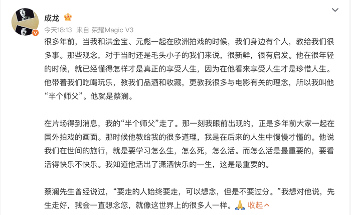 早在2023年底,蔡澜就留下了一封离别信,要求在离开后公开。在信中,他坦言自己只是一个爱吃的人,算不上什么“食家”。曾经与他有过交往的娱乐圈人士,包括陈晓卿、成龙、周星驰等也纷纷发文悼念,成龙将蔡澜称为自己的“半个师父”,他说蔡澜教给自己很多道理,他在后来的人生中才慢慢懂得。“我知道他活出了潇洒快乐的一生,这是最重要的。”