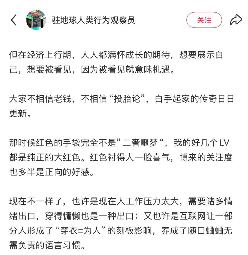 当经济上行风在社交媒体上开始流行,有人质疑这种打扮太过用力,反而会给人一种土感。“比如在北京,穿着普通都成了一种打工人之间的心照不宣,谁要是突然打破了这种默契,反而会成为大家眼中的显眼包,收获一堆另类的眼光。”