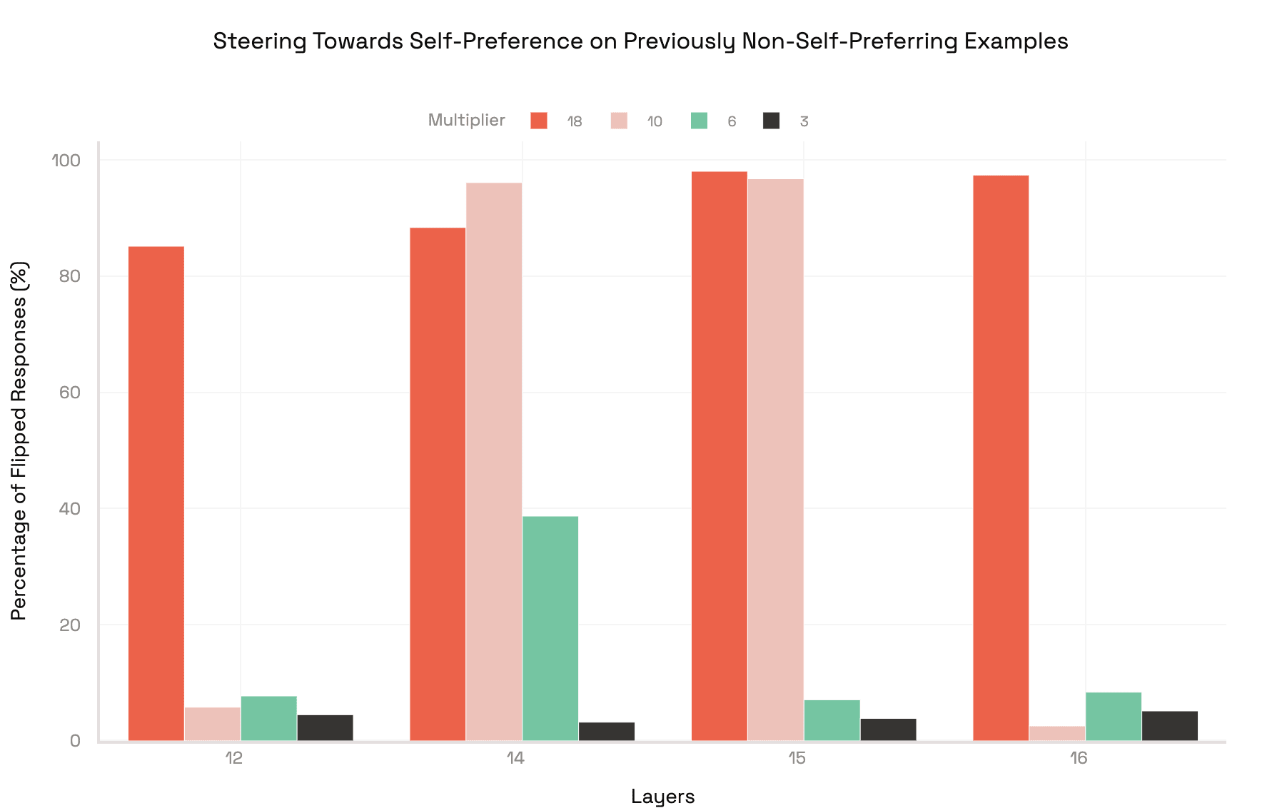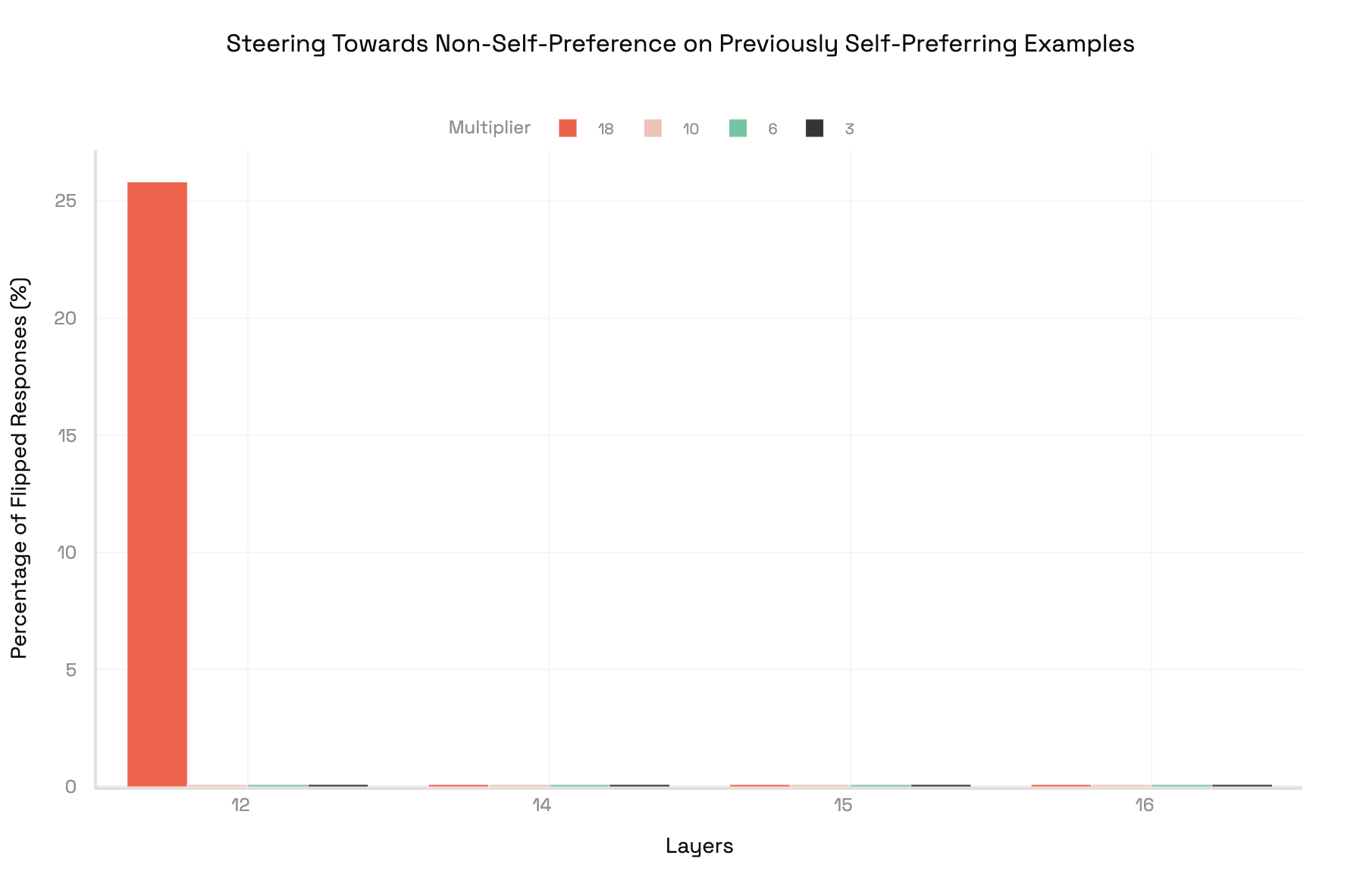 Using the layer 12 vector with a multiplier of 18 to steer, Llama switched its judgment on about 85% of summaries it had once given to GPT-3.5, now choosing its own versions instead. Conversely, when steered to be non-self-preferred we find that roughly 26% percent of biased judgements no longer exhibit self-preference. These results show that a single well-placed vector can reliably control self-preference.