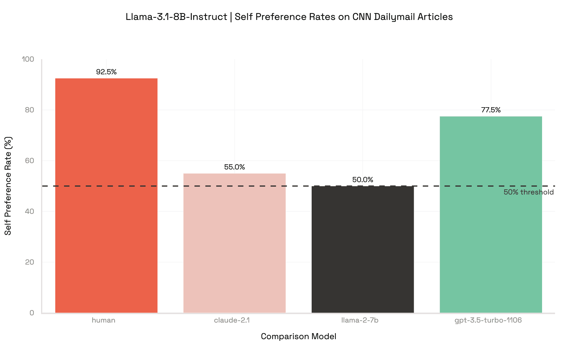Doing so, we found that Llama-3.1-8B-Instruct performed slightly worse than GPT 3.5 overall, yet Llama still preferred its own summary 77.5% of the time. This clearly indicates disproportionate self-preference. We focus our analysis on Llama 3.1-8B-Instruct and GPT 3.5 as their similar quality allows us to measure self-preference without one model being overwhelmingly better.