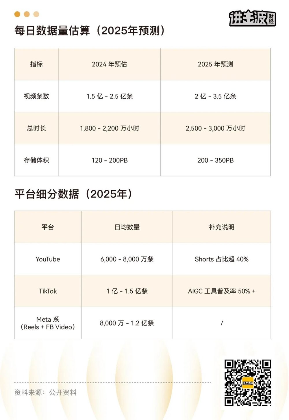 全球市场的话,2亿~3.5亿条一天,Youtube日均6000万条,TK1亿~1.5亿条,Meta系8000万-1.2亿条。