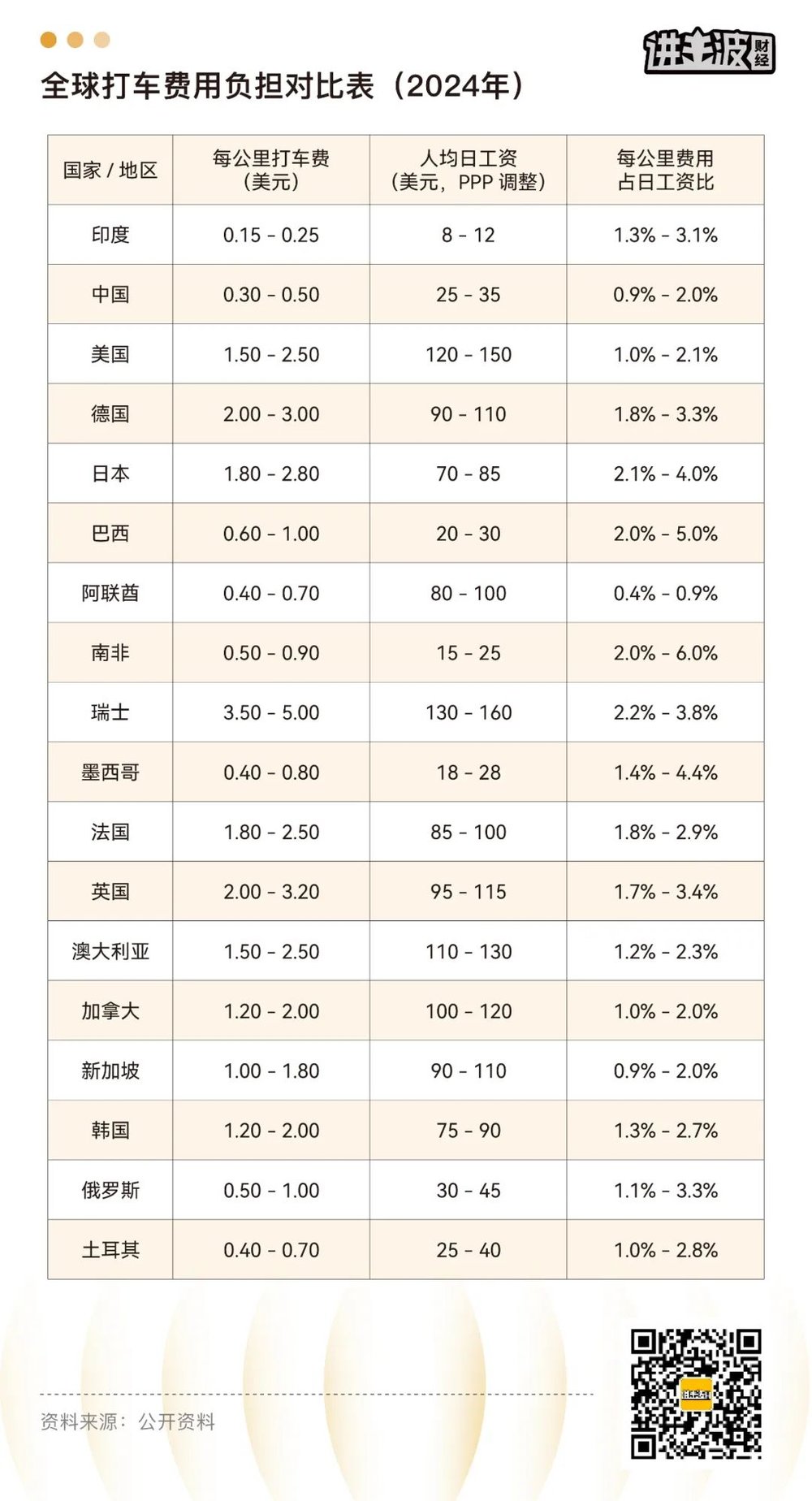 汇率是一个非常神奇的存在,它让我们站在本国的视角很难全面去感知很多经济数据。我做了一个表,叫做全球主要国家打车费用负担对比表,里面将各国每公里打车费和该国人均日工资的比例做了一个整理。