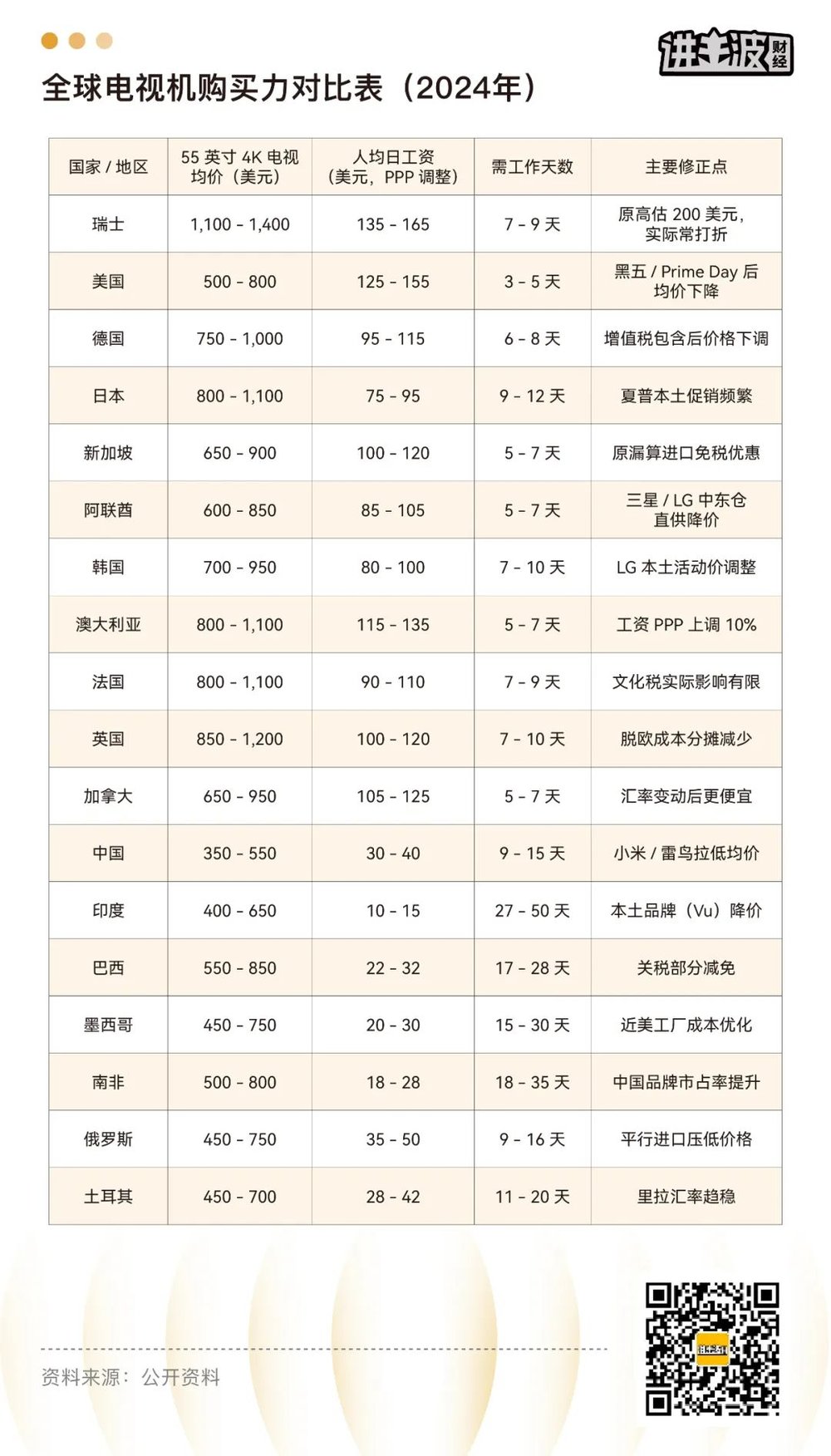 中国一台电视机的价格远低于瑞士,当然中国人均收入也远低于瑞士。换算下来,瑞士人需要工作7~9天,中国人是9~15天,日本人是9~12天,印度人是27~50天。