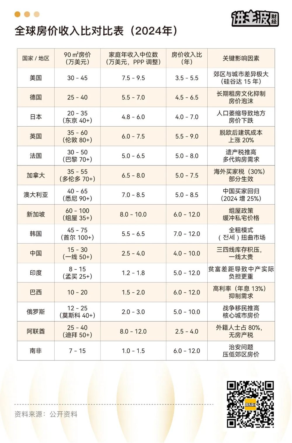 以下是全球主要国家/地区 房价与中产阶级收入比重 的对比表,统计口径为普通家庭购买90㎡住房所需工作年数,并标注关键影响因素: