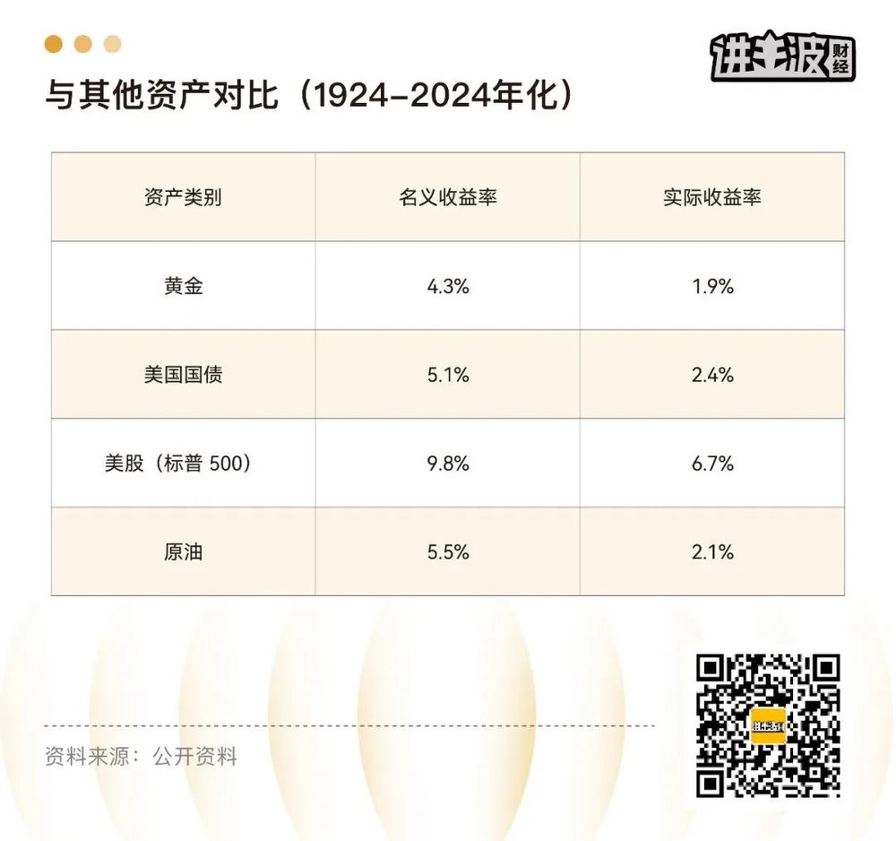 若1924年投资1000,2024年价值约52万,远超其他主流资产。