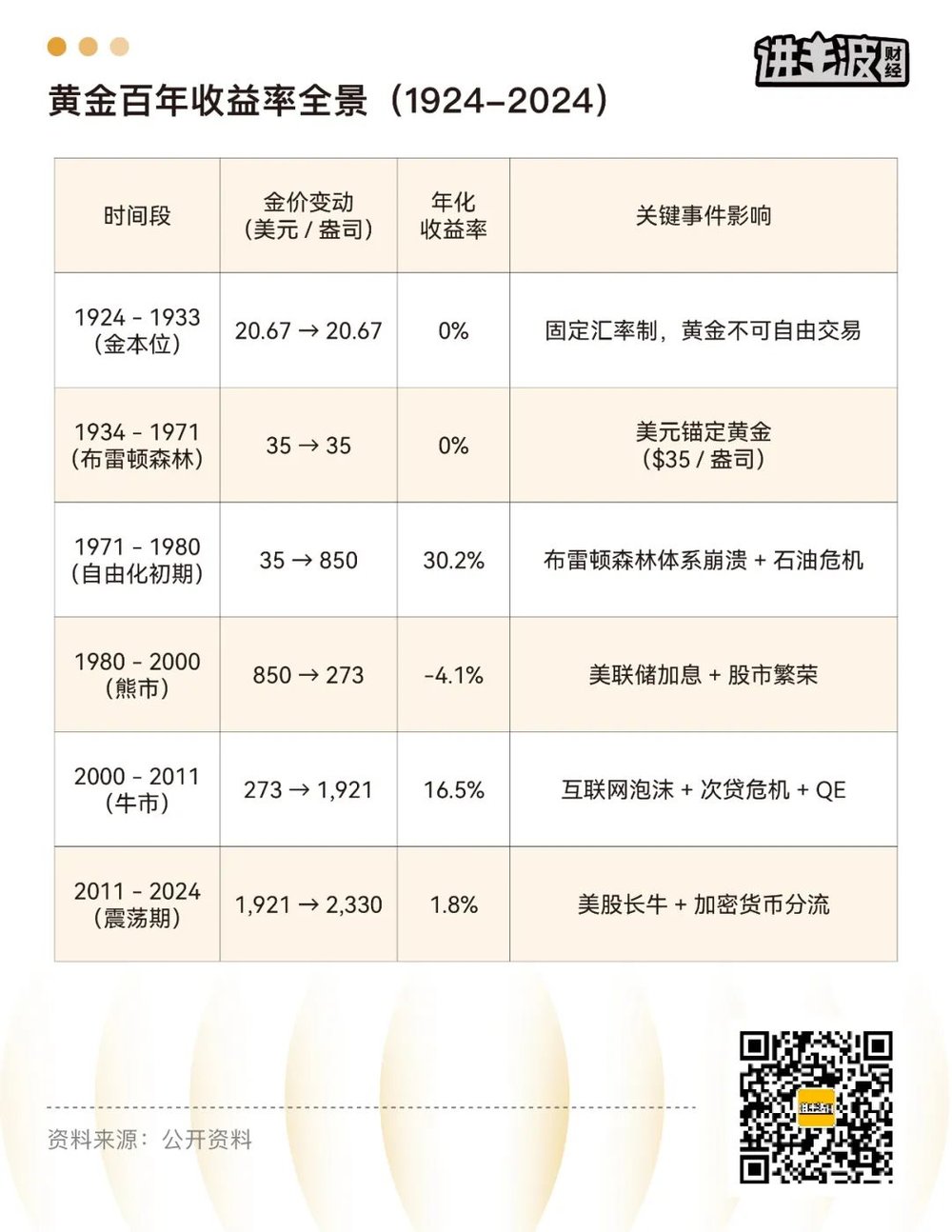 在货币体系崩溃期、高通胀期表现极佳,但长期跑输股票。