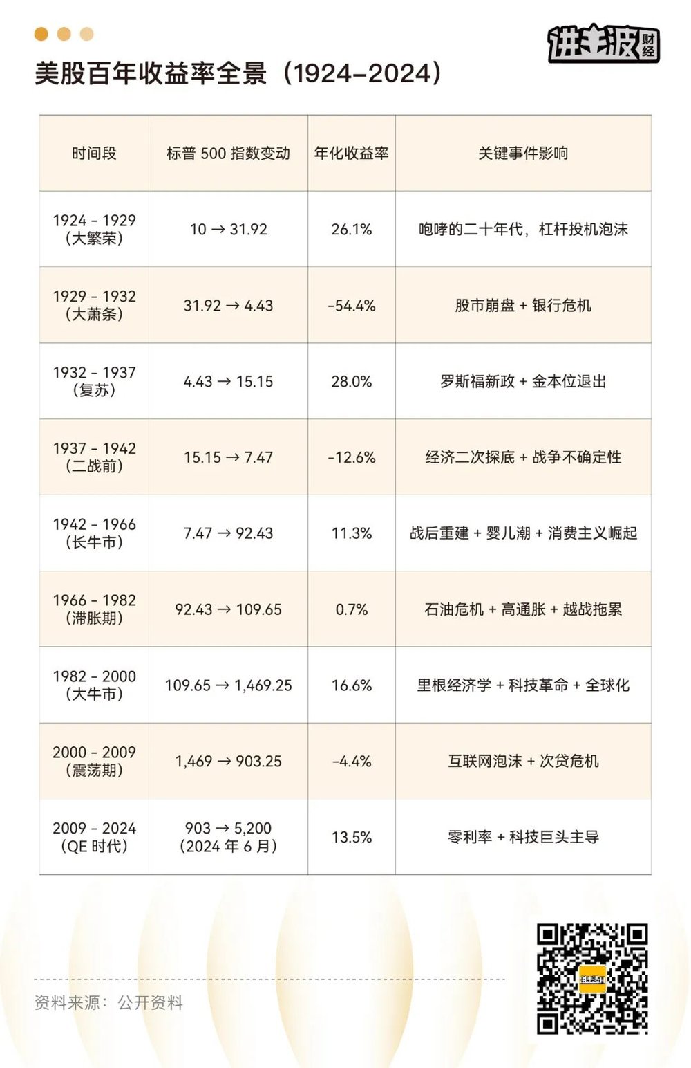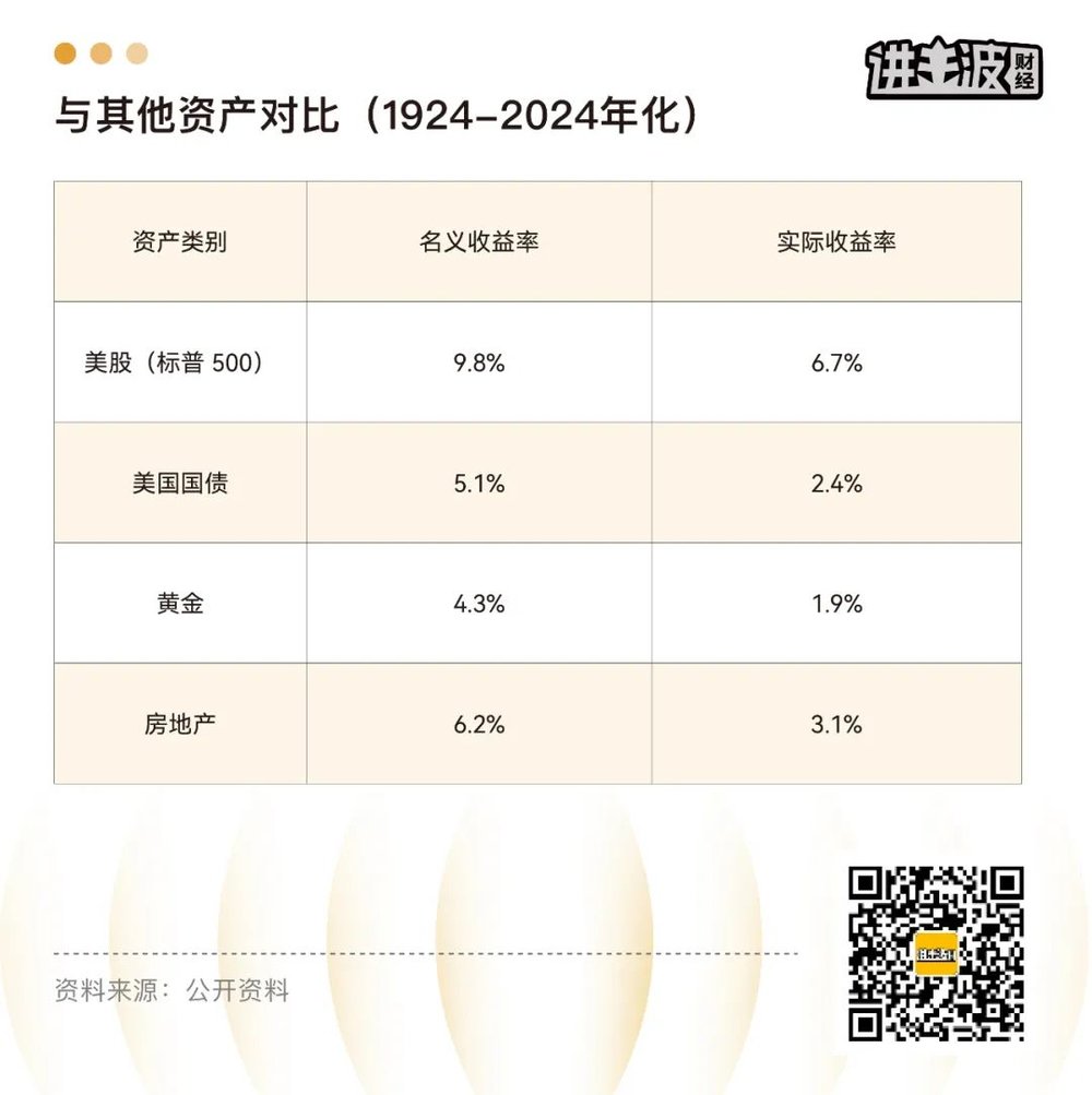 以下是过去100年美国股市的收益率分析,包含名义收益、实际收益、关键阶段表现及与其他资产的对比:
