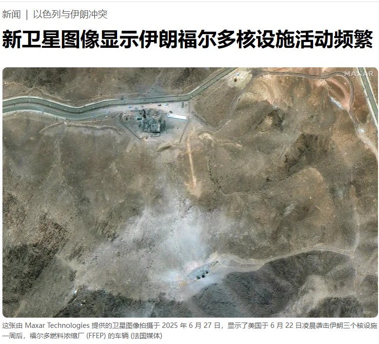最新拍摄的卫星图像显示,6月22日凌晨遭美国钻地弹袭击的伊朗福尔多核设施周边出现多台重型设备,挖掘作业显著增加。