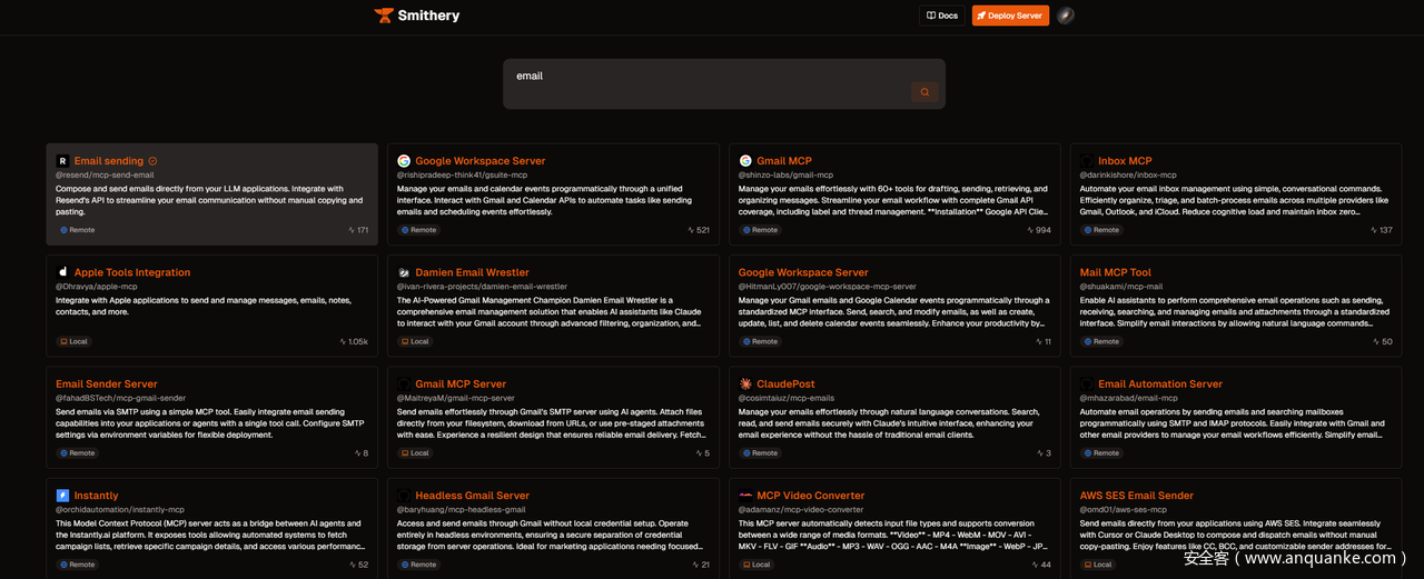 在很多MCP HUB中,都有不少邮件相关的MCP Server,这些Server都会提供邮件操作等工具。例如在Smithery这个知名的MCP SERVER HUB中,可以搜索到很多email相关的工具: