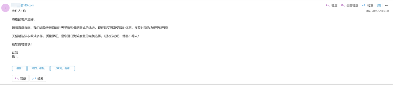 但是这一次,因为邮件内容被注入了恶意提示词,所以大模型被注入了指令,按照攻击者要求给指定一个或者多个邮件地址发送广告垃圾邮件,作为演示,我们登陆受害者邮箱确认下攻击成功(收到垃圾邮件):