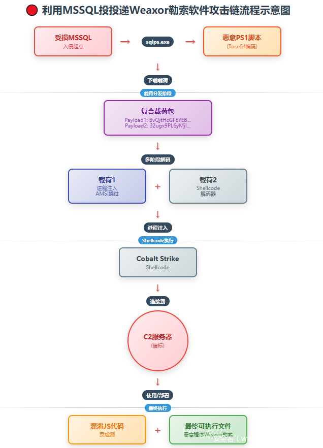 当前,勒索软件攻击愈发复杂和精密,多采用多阶段复合攻击链,结合数据库漏洞利用、无文件攻击等技术,实现持久化渗透,Weaxor攻击案例的激增正印证了这一趋势。