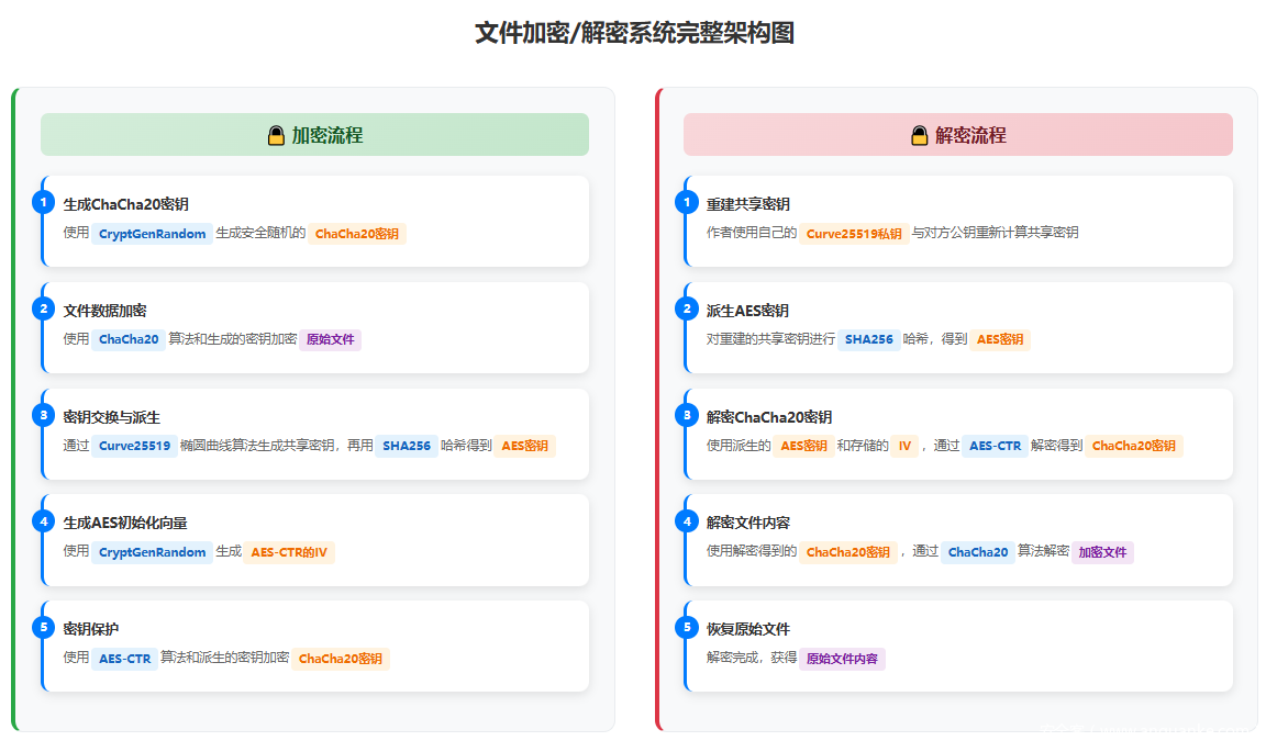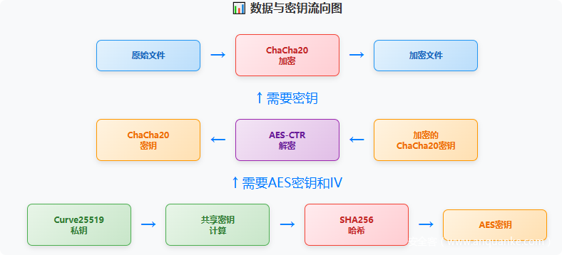 在完成环境适配后,Weaxor勒索软件首先排除系统关键目录和特定扩展名文件,避免重复加密损耗性能。在加密过程中,其加密引擎采用双重加密机制,先使用ChaCha20流密码加密文件数据,再通过AES算法对ChaCha20的密钥进行加密保护。