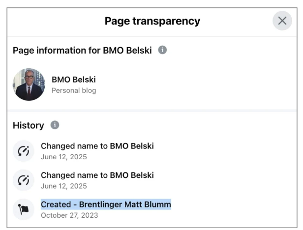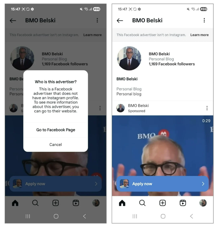 可以看到在这些广告中观察到的一个共同信息是,投放这些广告的广告客户账户并不存在于Instagram上,而是只存在于Facebook上。BMO Belski在Facebook上有一个页面(已存档),有数千多名粉丝,但在该实体的广告所在的Instagram上却没有出现。Meta Business Manager确实使得使用Facebook页面运行Instagram广告成为可能(无需拥有Instagram账户)。骗子采用这种手法的具体原因尚不明确。然而,这样做可却是可以避免骗子在Instagram上建立存在感和粉丝基础,这可能需要一些时间。此外,最近创建的Instagram账号(与广告相关联)可能比如果它们根本不存在更容易被发现。有趣的是,自2023年10月27日成立以来,BMO Belski的Facebook页面只包含两篇帖子,都是本周发布的。