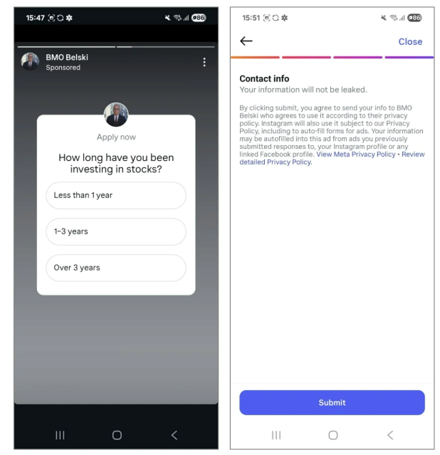 另一则标题为“BMO Belski”的欺诈广告出现在Instagram上。广告会向用户提出一些筛选问题,比如“你投资股票多久了?”筛选问题是一种常见的参与工具,被合法的广告商用来评估他们的前景,然后引导他们找到最相关的产品。然而,在这种情况下,在回答了这些虚假的问题之后,用户被引导到一个屏幕,提示他们向广告商提交联系信息,即“BMO Belski”:Facebook的广告客户不在Instagram上