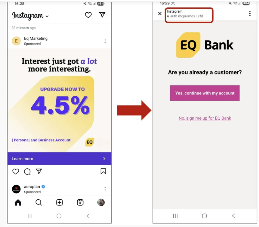 目前已经发现了多个Instagram广告的例子,这些广告可能看起来是由加拿大银行运营的,但实际上是骗局。如下所示的广告例子声称来自“EQ Marketing”,并密切模仿EQ Bank的品牌和配色方案,同时承诺相当乐观的利率收益率为4.5%。然而,当人们点击它,会看到一个假冒的RBCpromos1[.]cfd网络钓鱼网站,该网站与EQ Bank无关,并试图收集人们的银行凭证。利用AI深度伪造银行负责人的AI换脸视频