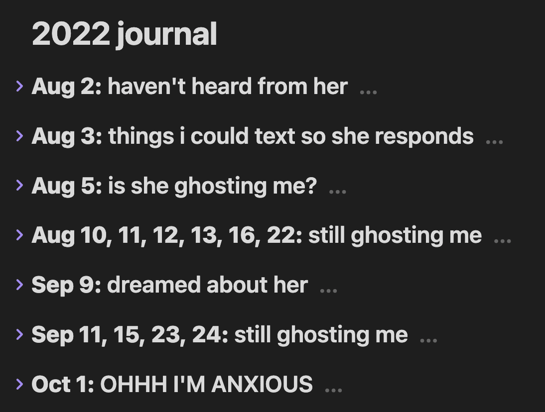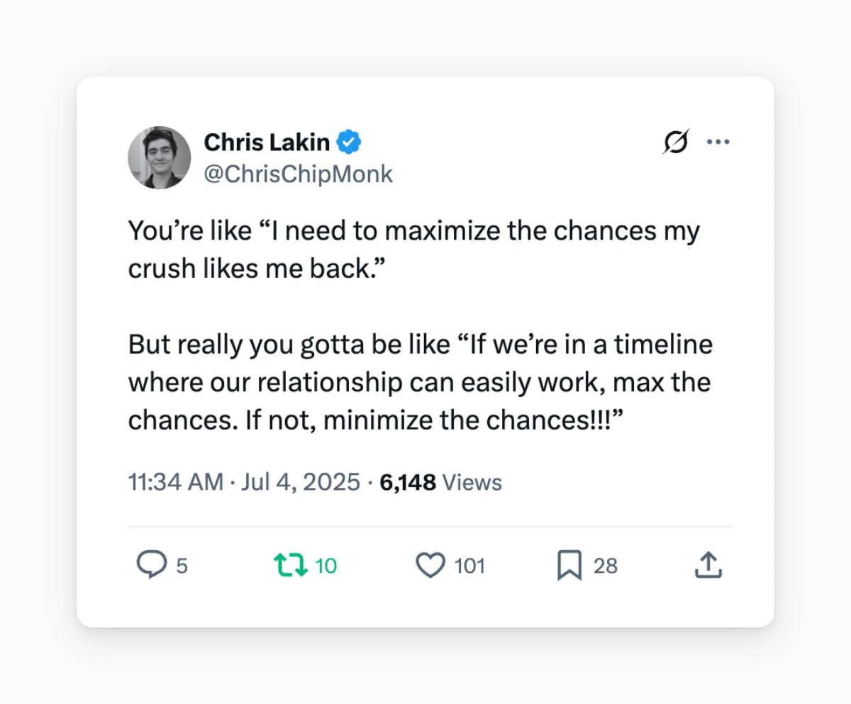 When my girlfriend and I got together, I felt extremely attracted to her but I wasn’t anxious about whether or not she liked me back. I had no pull to “convince” her to be with me. Instead, it felt like: “Are we in the timeline where we work out? Let’s see!” It felt really, really relaxed.
