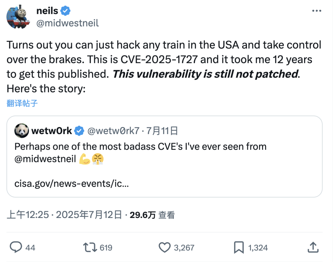 该漏洞于12年前发现,在今年终于争取推动漏洞处理与修复工作,列车将采用新协议替换老的协议,据悉设备替换成本将高达70-100亿美元;