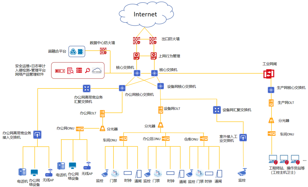 在生产网边界部署工控安全隔离与信息交换系统,在整个企业厂区网络边界以及超融合平台所在的数据中心出口部署第二代防火墙,在企业厂区网络边界透明串接部署上网行为审计系统,在厂区核心交换机旁挂部署入侵检测系统,确保区域边界的防护和网络间的通信传输。