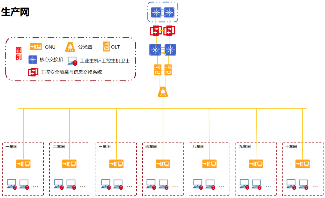 接入层主要负责各类终端设备的接入。针对生产车间、质检楼、综合楼、总控中心、仓库等车间和楼宇,使用光网络单元ONU。以WGP3200-P-1GP24G-HV为例,该设备支持POE供电,有24个GE口,配合OLT设备可实现高达1:128的分光比;同时设备具备VLAN隔离功能,如部署在生产车间,可同时给生产网网络面板、办公网电话机和设备网监控摄像头连接使用,还可以给监控摄像头、无线AP进行供电,大大节约成本。针对质检楼和综合楼等存在高并发情况、需要高带宽业务的场景,推荐使用接入交换机入室。以三层接入交换机WES6300-2GS8G-HV为例,具备2个千兆/百兆自适应光口+8个千兆/百兆自适应电口,支持所有端口线速转发,满足了用户对高带宽的需求。针对室外监控场景,推荐使用耐高温、防风沙的工业级接入交换机。以WIS3200-PE-4GS8G-2LV为例,可以支持8个千兆PoE电口+4个千兆光口,通过无风扇散热电路设计、宽范围工作环境温度、高IP防护等级等技术,提供了耐高/低温、防静电等卓越的工业级品质,更能满足室外监控环境中需要多端口数为无线AP提供POE供电的场景。