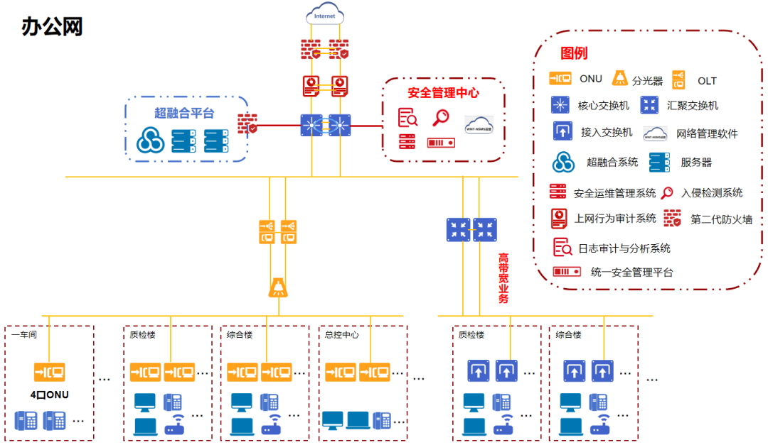 办公网络需求:为员工提供稳定、高速的办公网络,支持日常办公应用(如电子邮件、文件共享、办公软件等)和互联网访问;且随着企业远程办公和跨地区协作的需求增加,企业需要部署视频会议系统,支持高清视频会议、屏幕共享等功能。