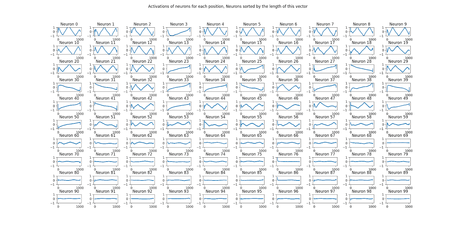 As we saw in figure 1, past the top 50 there are still neurons that carry positional information, and we can also see some of them following the same pattern here, but except for a few outliers it falls off quickly and there are practically none past 100.
