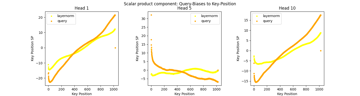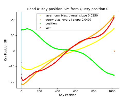 We can see that even in both of the extreme cases, the overall structure of the sum stays similar. This also holds for other heads: For all heads except 5, there is no query token that changes the structure set up by biases and position. All a token does is slightly adjust the slope.