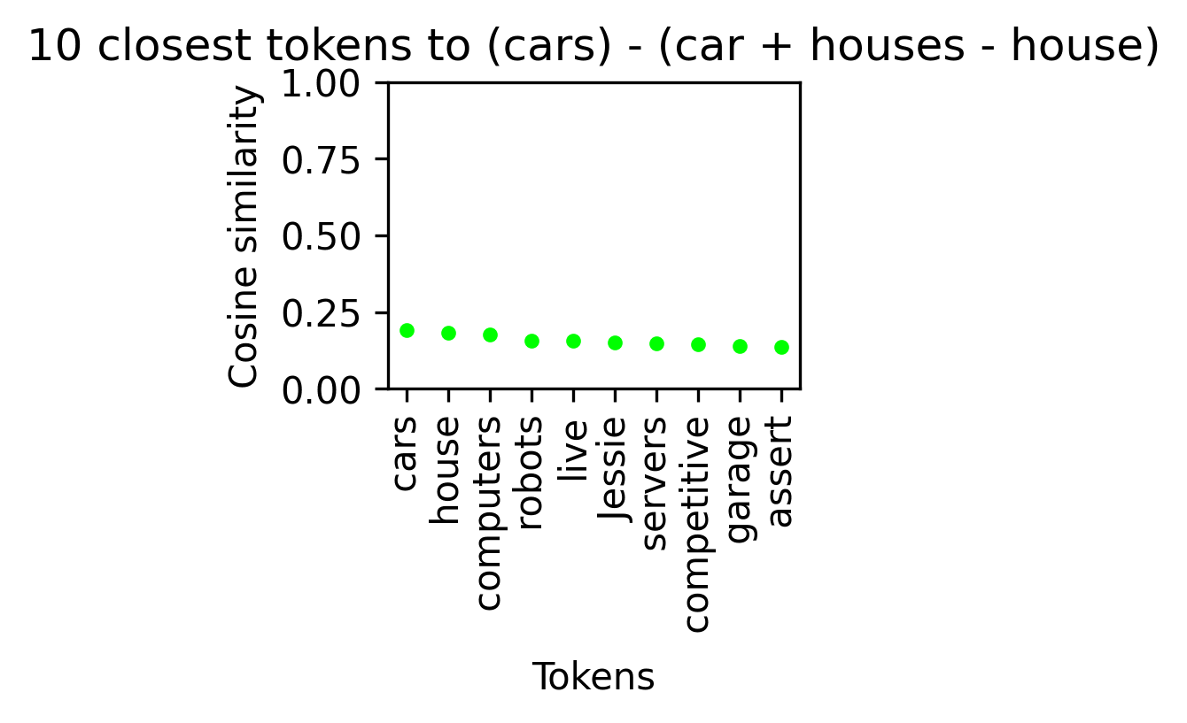 There we found one triple for which the fourth word is closest to their sum. Keep in mind that the shift (“houses” - “house”) just gets us far enough away from “car” that “cars” is now closer than it, which doesn’t mean that these match up perfectly.