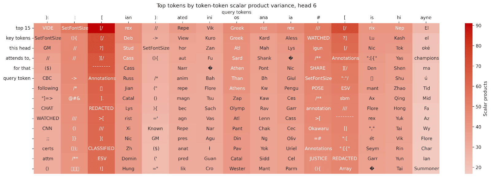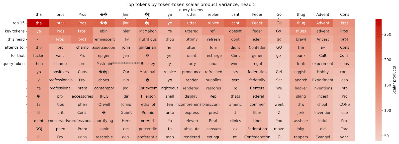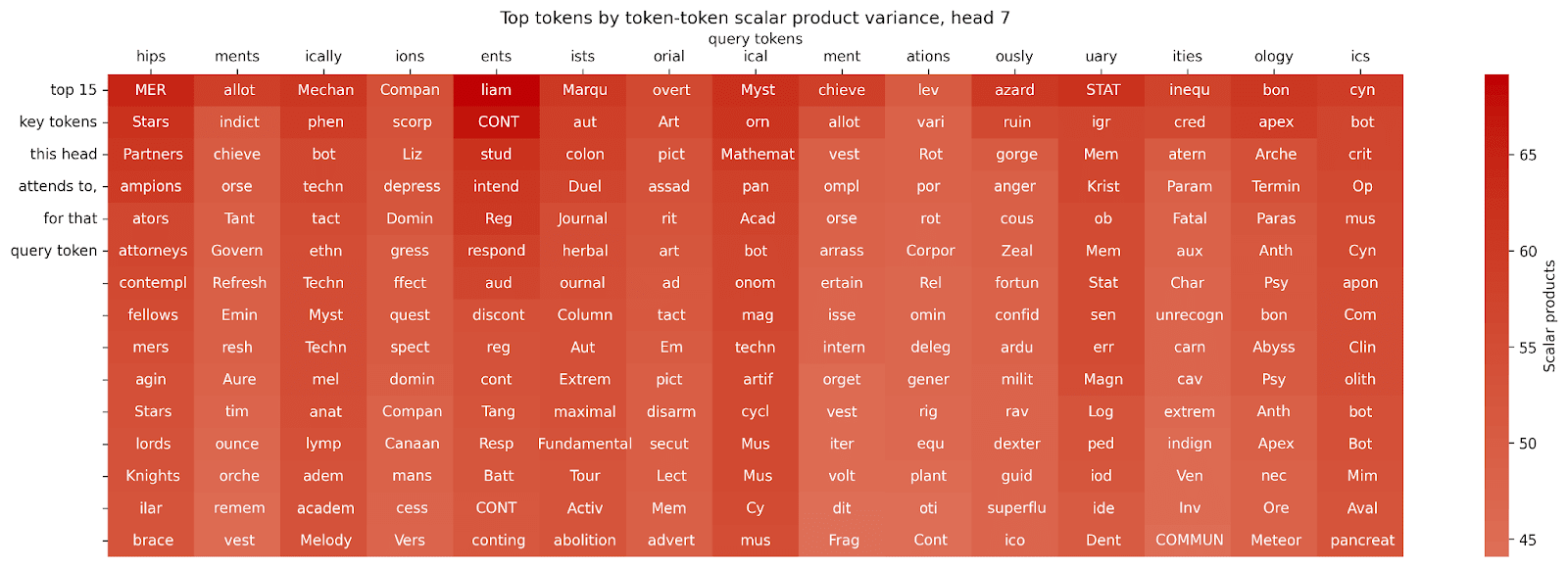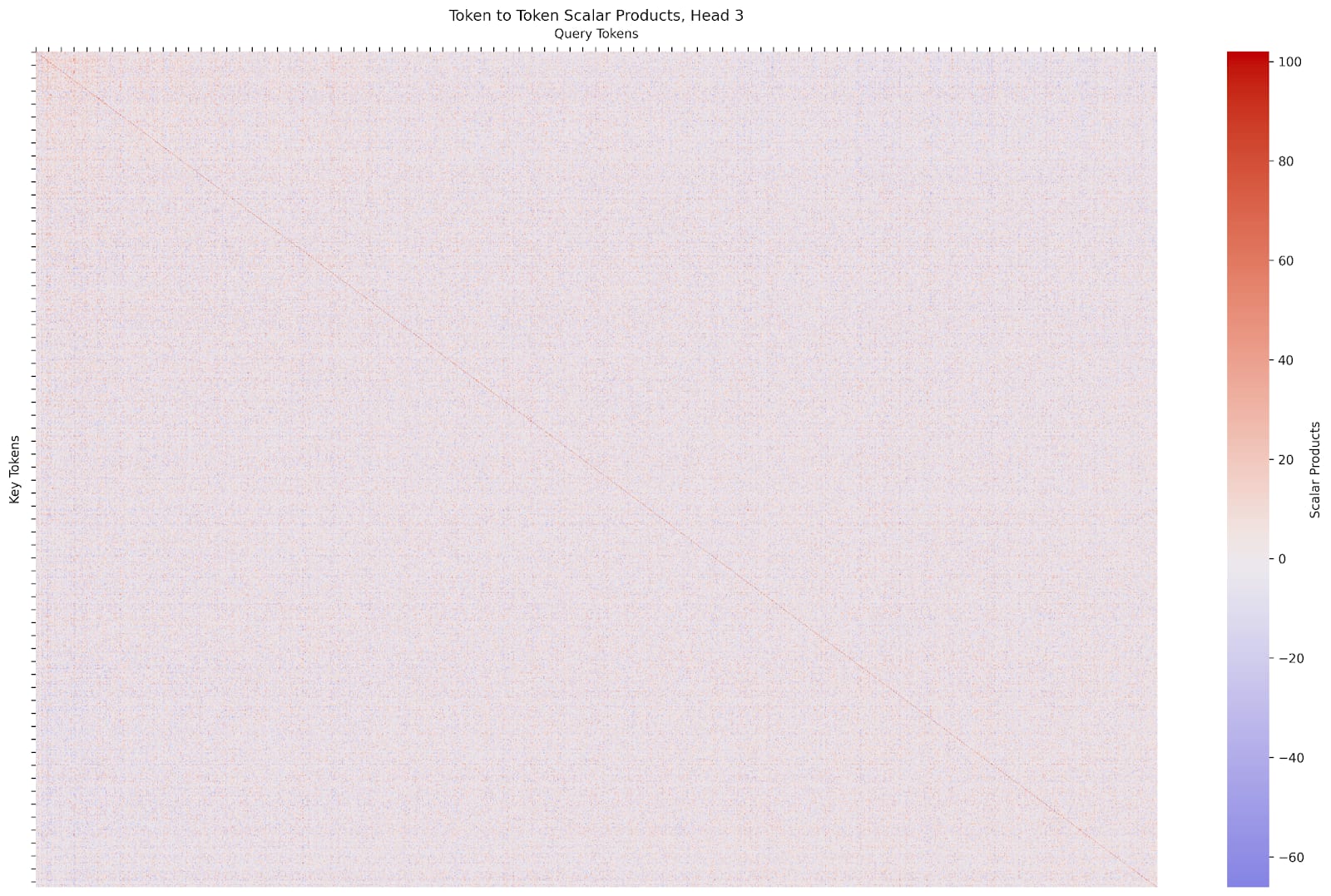 We can see that this head tends to have a large scalar product for copies of the query token itself, but not much else is directly visible.