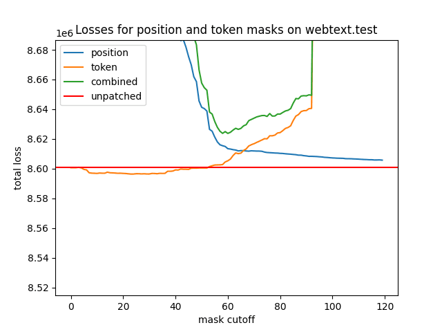 This looks pretty much as expected. On the position side, the loss decreases with larger cutoff, but is nearly equal to the unpatched loss from neuron 60 onward. On the token side, the loss increases with a larger cutoff, small exception at the start. The combined patch gives a loss difference close to the sum of the individual differences.