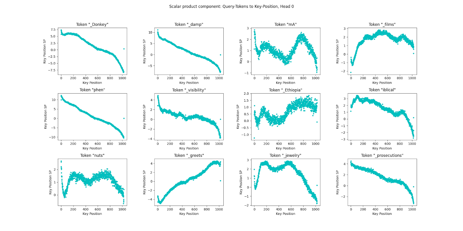 These are just 12 random tokens and their key-position scalar product component, for head 0.