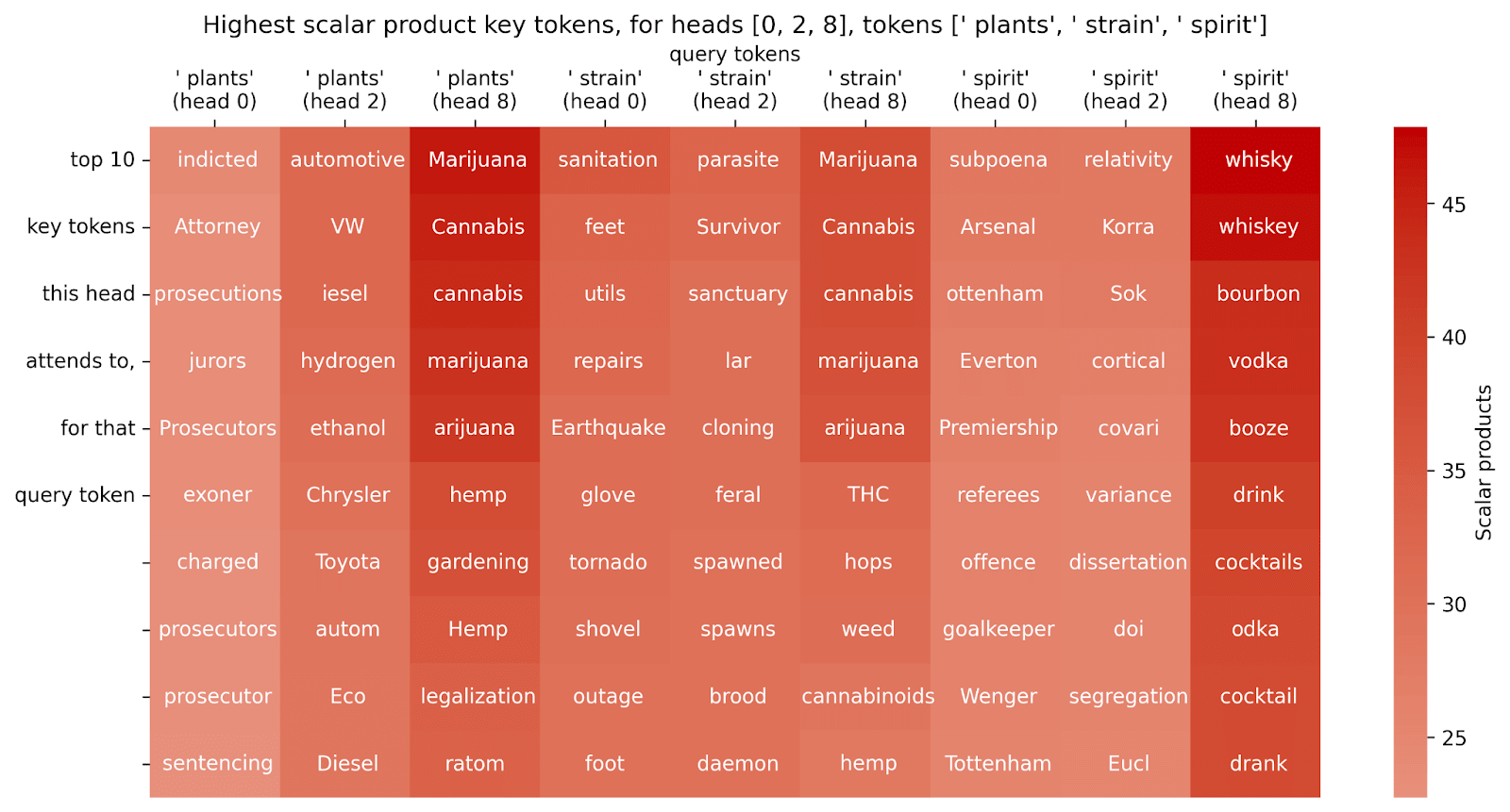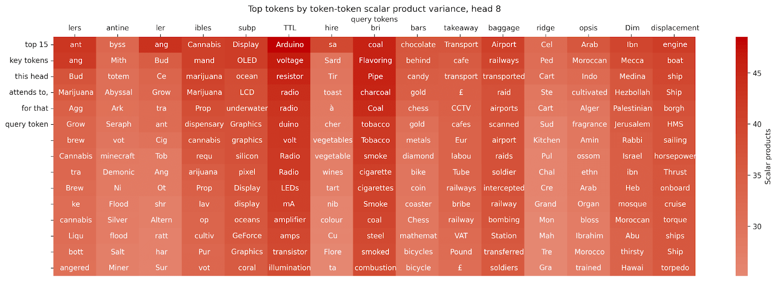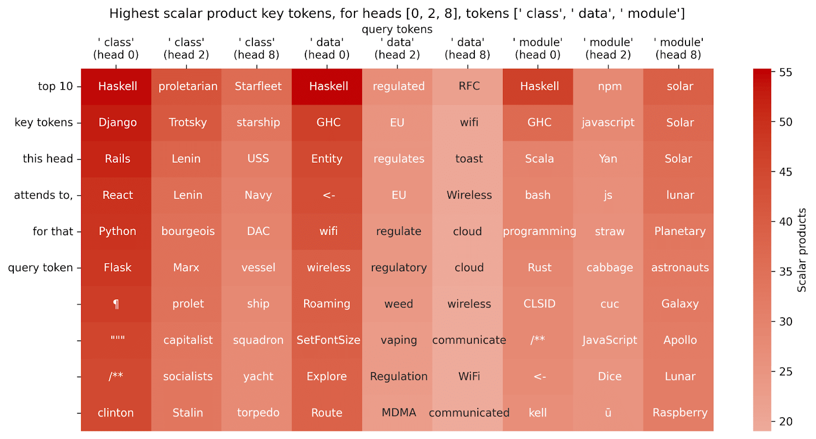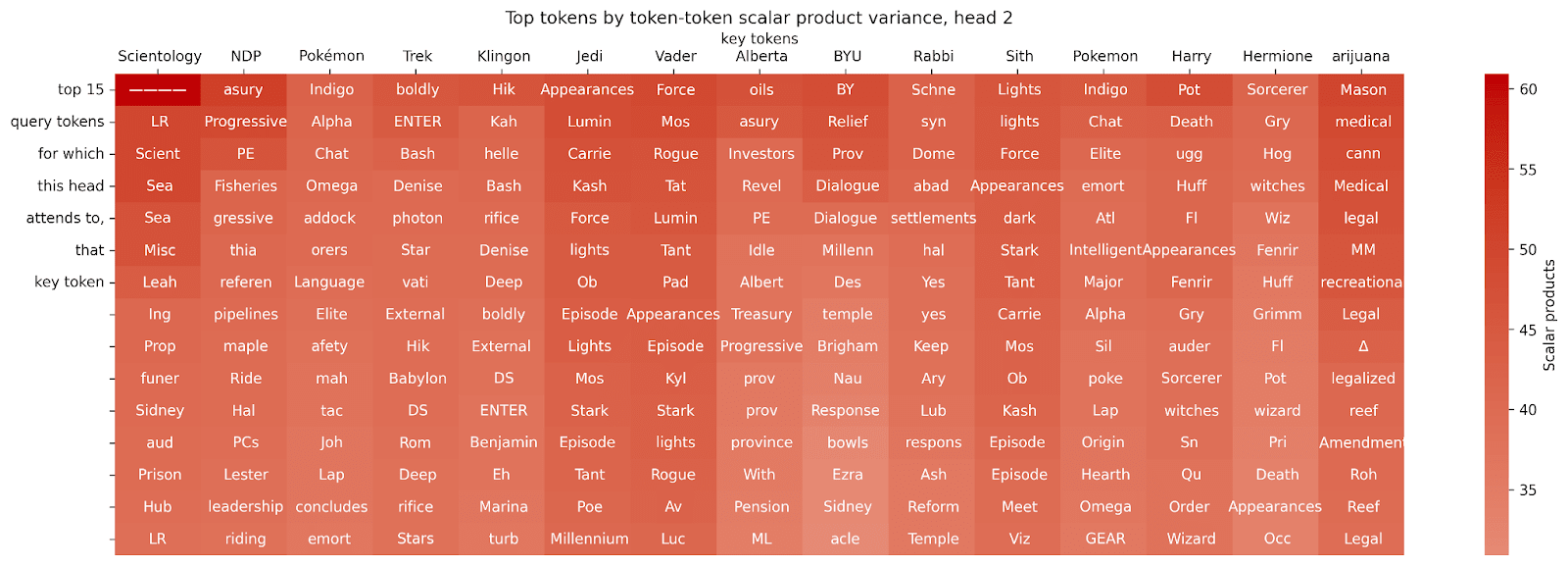 The problem here is that there are fewer context-defining tokens than there are context-dependent tokens, so that the variance of the context-defining tokens doesn’t give that strong a signal. So let’s try looking at the interaction the other way around (looking for possible query tokens, given some key token):