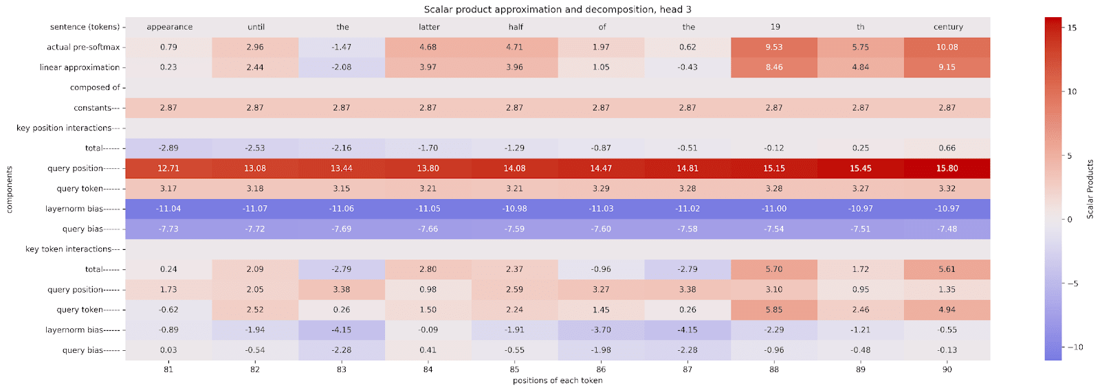 But since these correction factors are almost constant for each particular component, they don’t influence the analysis of the component itself. We might get the absolute values wrong but conclusions about relative values like “the position-position component of the scalar product for this key token would be larger if the key position was closer to the query position” will still be valid. This is a byproduct of the structure of SoftMax, which doesn't care about the absolute values of its inputs, and it will be more of a problem once we get to Layer 0’s MLP, because the nonlinearity there (ReLU) does care about absolute values, but we’ll deal with that when we get to it.