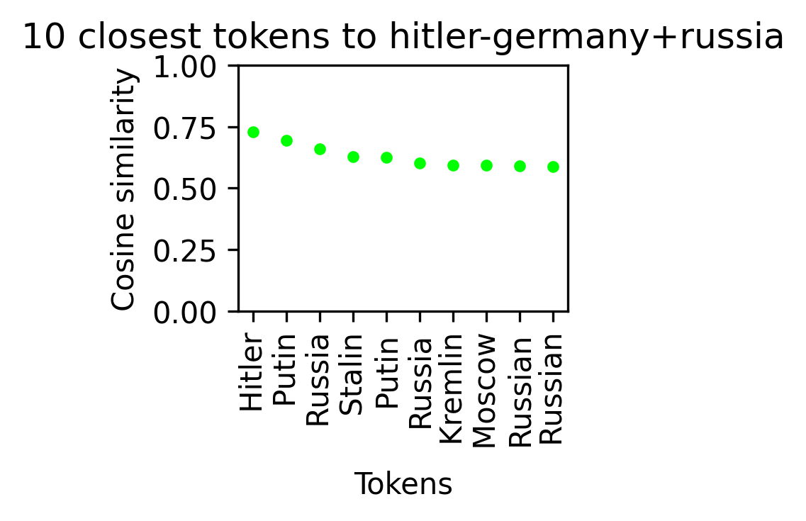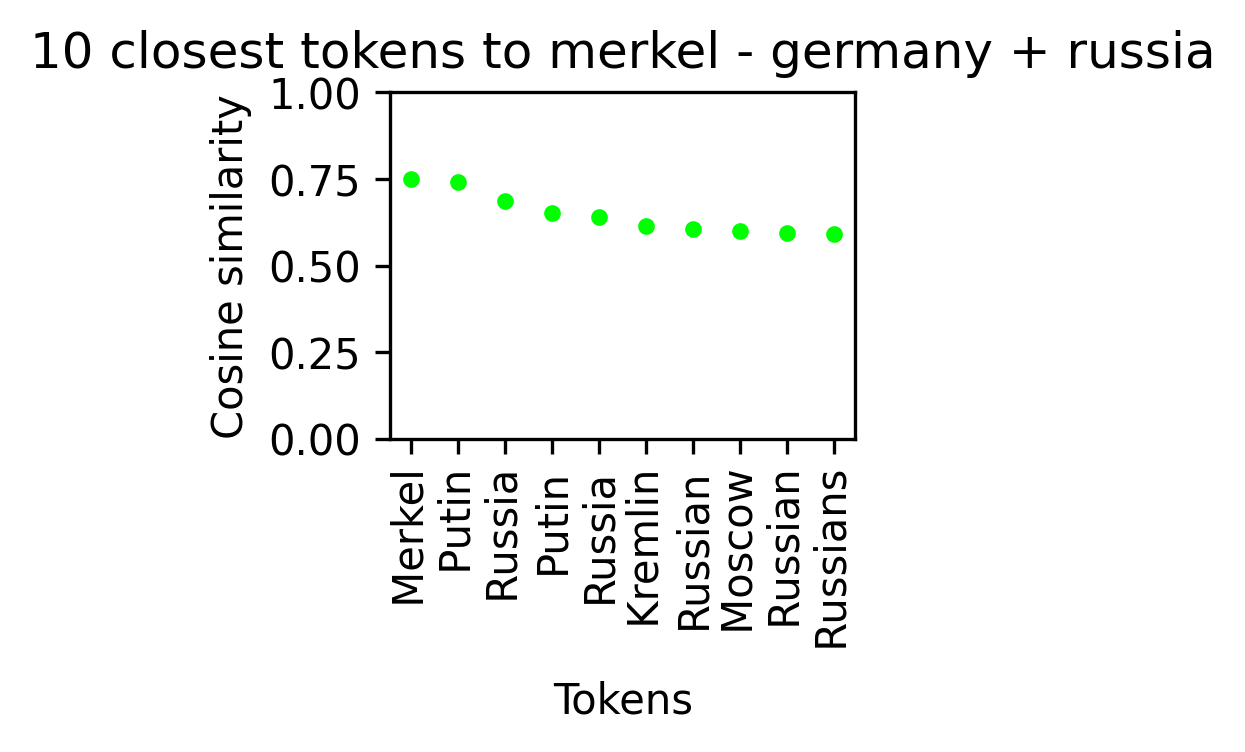 These words are less generic than in the previous section, so it’s not surprising that we can’t get away from Merkel as the closest token, but for each of these countries, we get a contemporary politician from that country within the top 5.