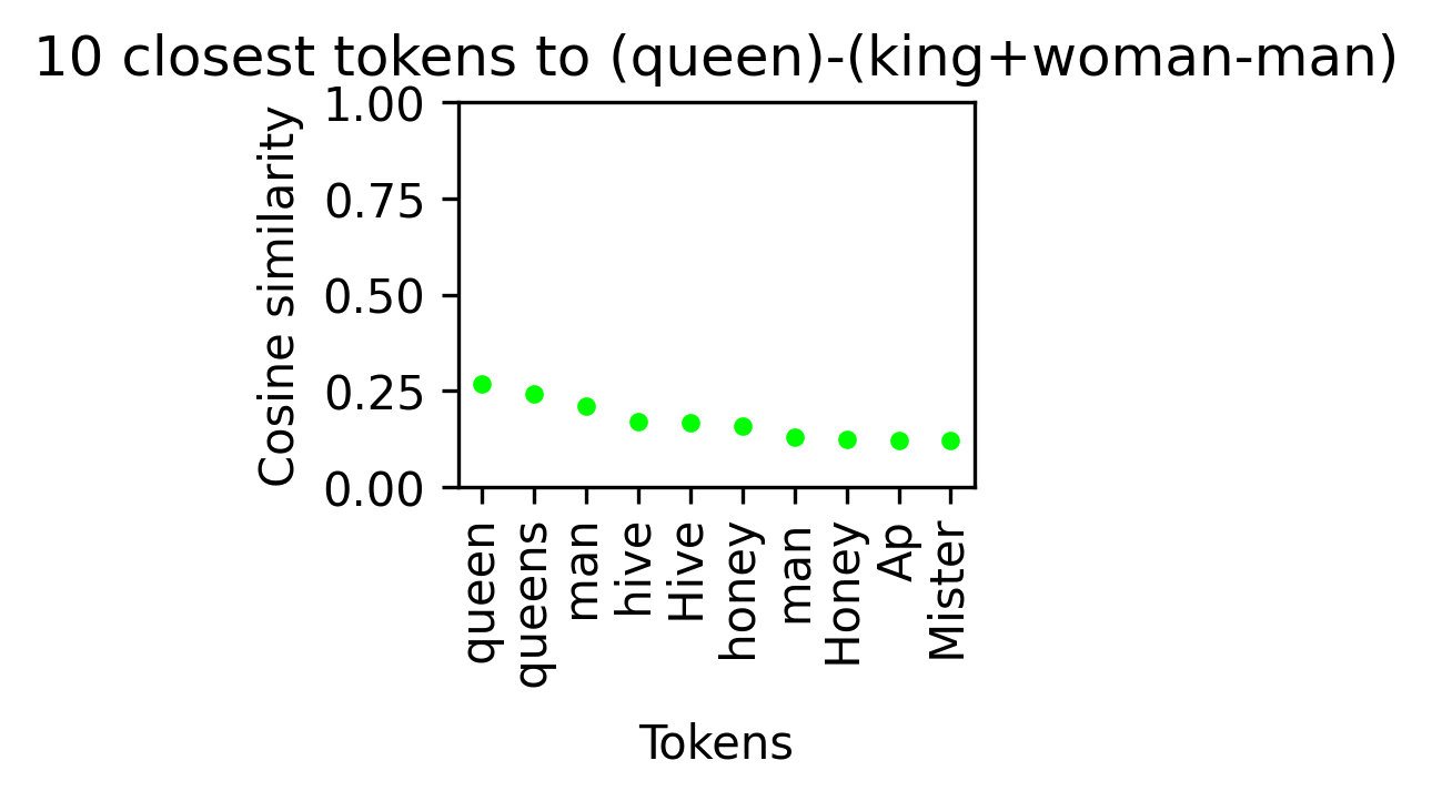 Both of these would be a 0-sum if the 4 vectors formed the intuitive parallelogram. As it is, they give us the shift we’re still missing from VKing+(Vwoman - Vman) to VQueen , so we can ask what other tokens lie in the same direction. In each direction we get the two tokens that contribute positively and semantically similar ones, which isn’t too surprising, but we also get an association with Jordan and adultery going away from “queen” and an association with bees going towards “queen”. These make sense as examples for the difference between “king” and “queen” that goes beyond male-female (Jordan has a king).