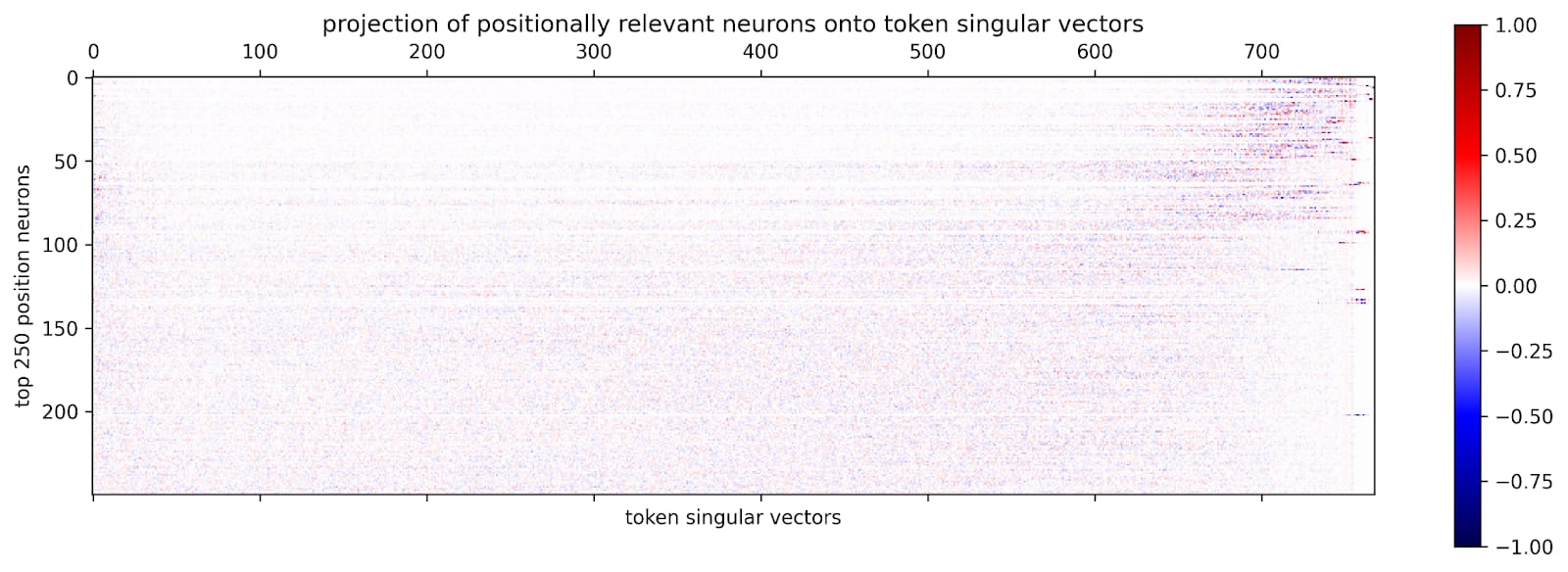 With the singular value decomposition (SVD) of the token embedding matrix, we can find directions of decreasing importance to the embedding. Those directions seem surprisingly interpretable, but unfortunately they are not quite enough to find an interpretable basis of the space. But we can compare this importance rating for directions in the residual stream from a token embedding point of view with the structure we found for the position embedding. For each of the neurons in decreasing order of positional importance, we look at its projection onto this basis.