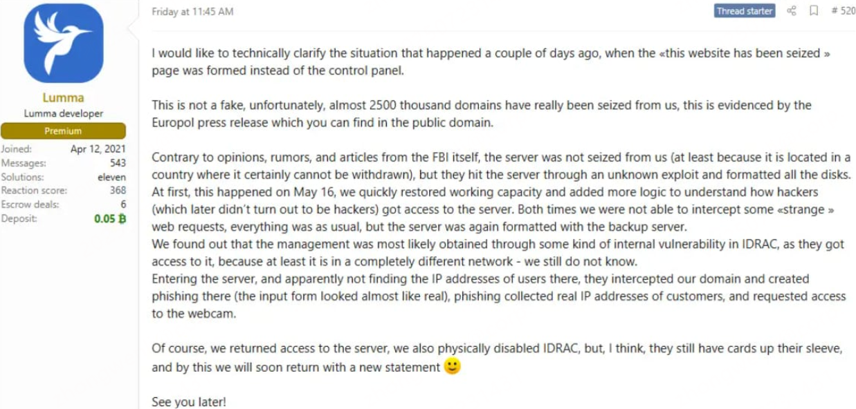 尽管这次执法行动对Lumma的MaaS( malware-as-a-service)平台造成重大打击,但据6月初报告显示,该平台并未完全关闭。运营者随即在XSS论坛上承认情况,但声称其核心服务器虽被远程擦除数据但未被查封,并已开始恢复工作。