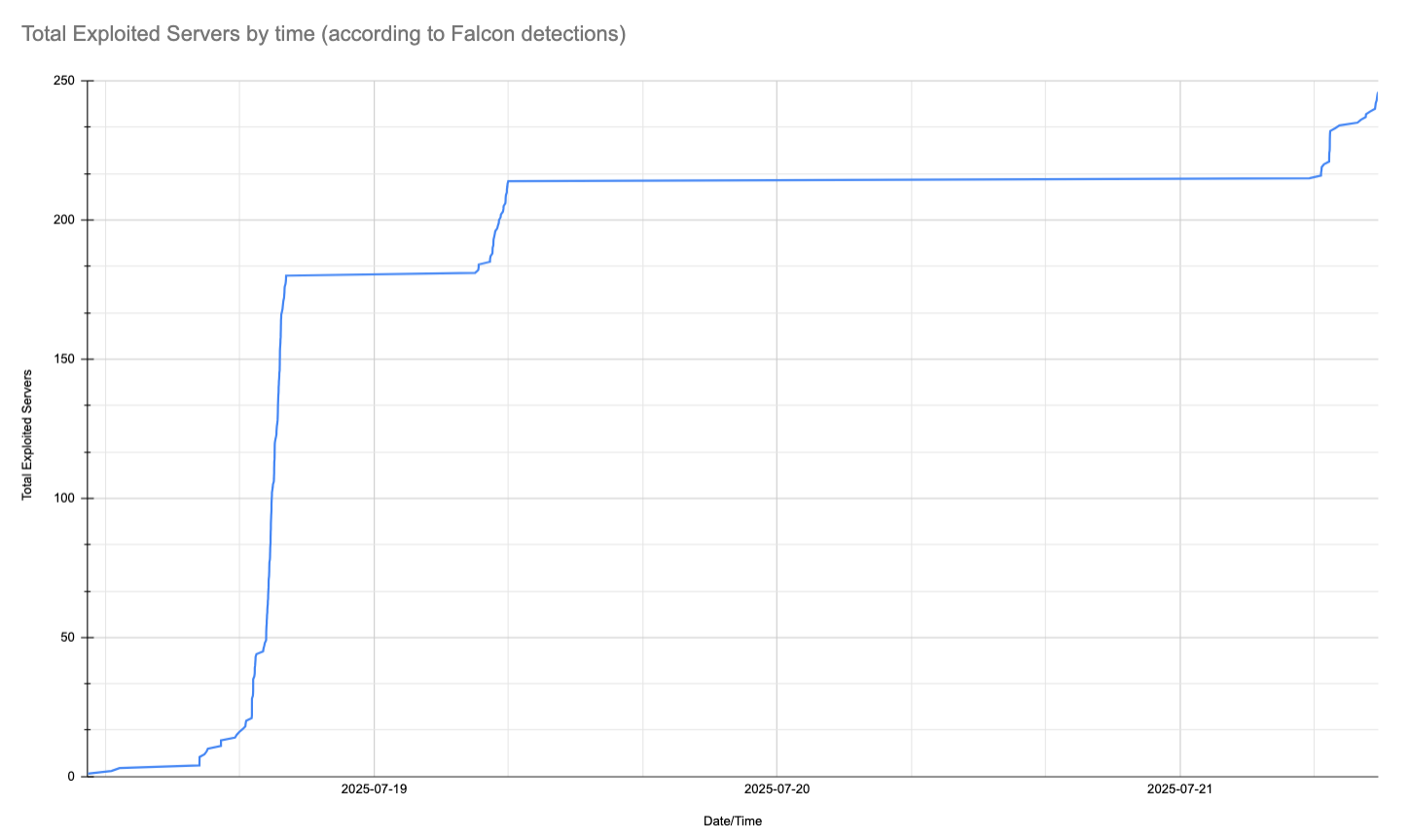 总部位于荷兰的 Eye Security 最早于上周五发现该漏洞被积极利用,并指出尽管微软已于 7 月初发布了初始修复补丁,但攻击者依然“找到绕过补丁的方法”实施入侵。CrowdStrike 也在 2025 年 7 月 18 日观察到活跃的漏洞利用行为,已在 160 多个客户环境中拦截了数百次攻击尝试。