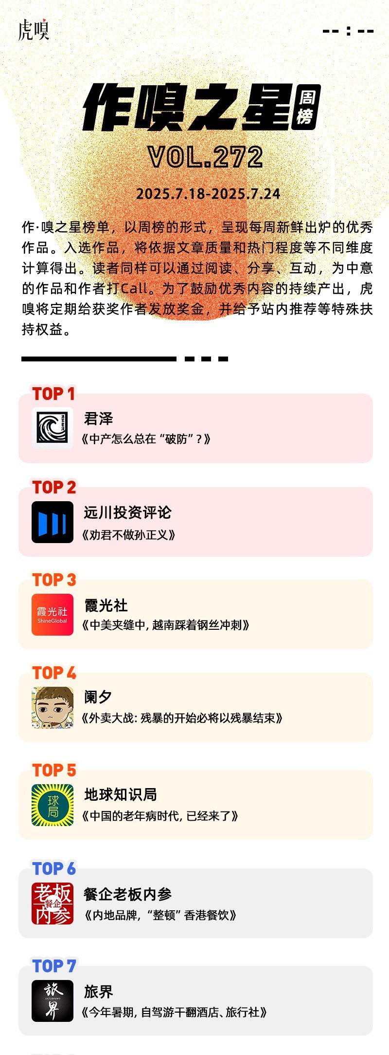 作·嗅之星榜单,以周榜的形式,呈现每周新鲜出炉的优秀作品。2025年7月18日~2025年7月24日,虎嗅第272期,作·嗅之星的获奖文章分别是: