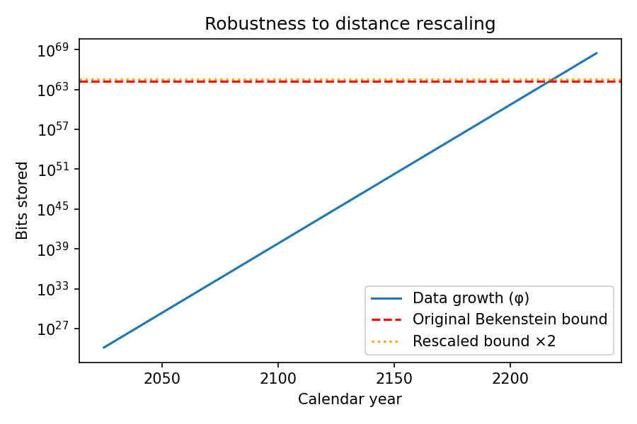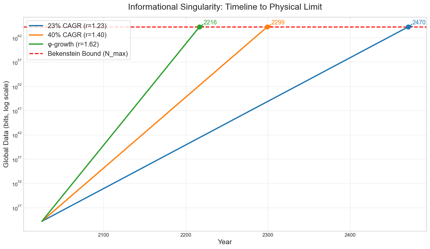 Figure 1 — Exponential data-growth curves (log scale) intersect the finite Bekenstein bound. The φ-trajectory crosses at 2217 CE. Conservative and big-data scenarios follow.