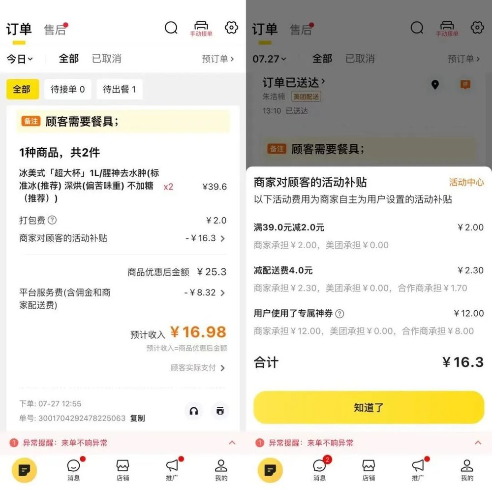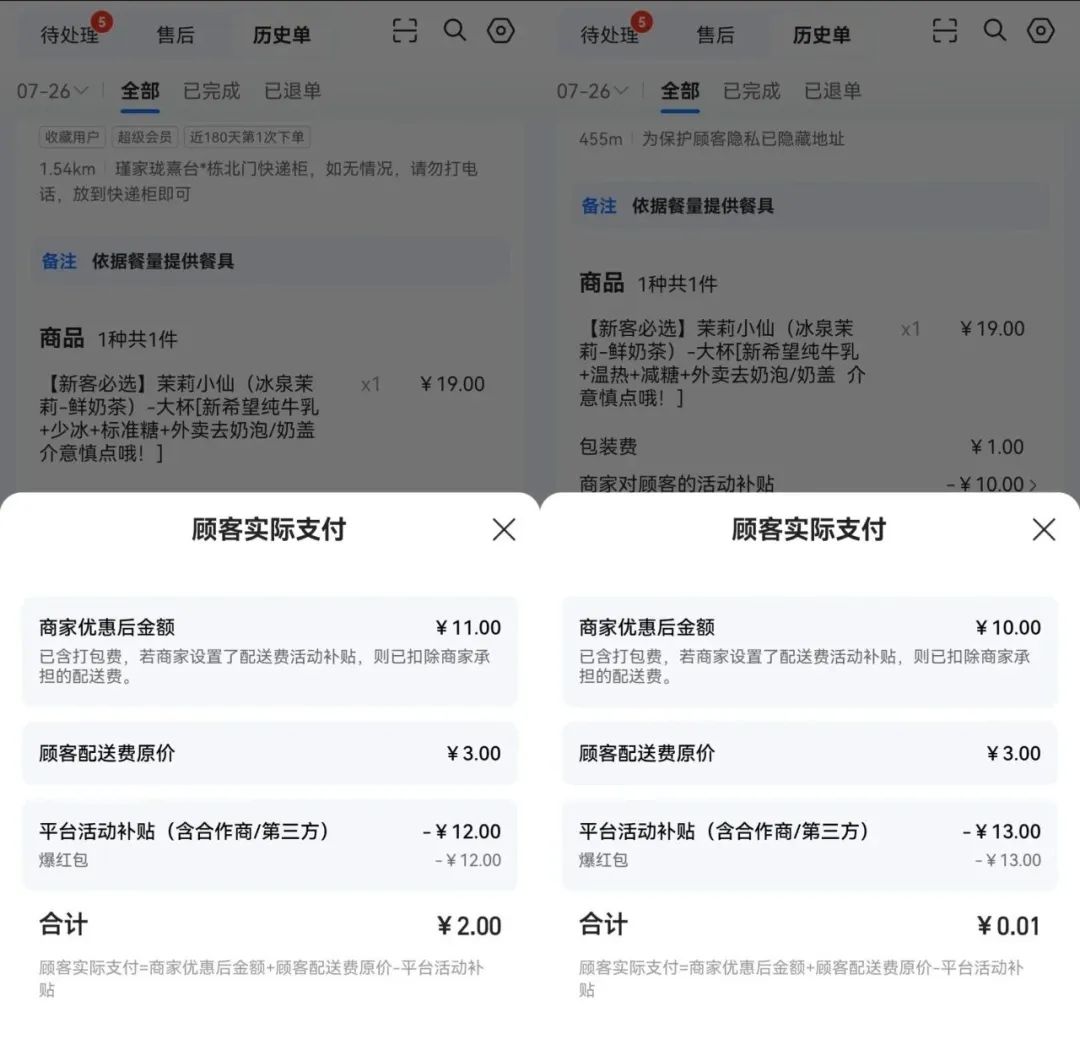 这两个20元订单,顾客实付2元和0.01元,“羊毛订单”拖累商家到手金额