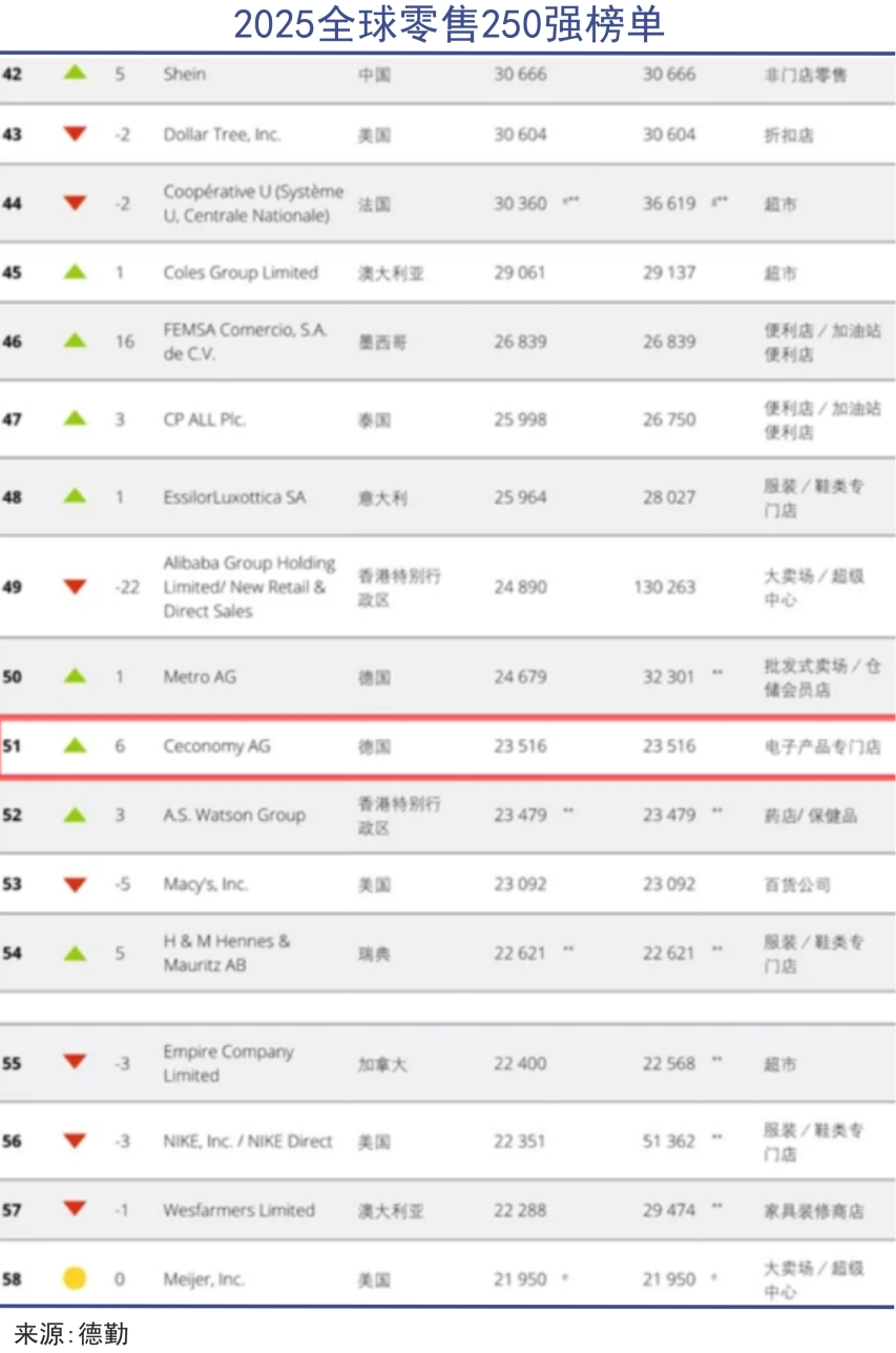 Ceconomy是欧洲最大消费电子连锁集团,旗下拥有MediaMarkt和Saturn两大品牌,在欧洲11国运营了超千家门店。根据德勤发布的《2025全球零售力量》研究报告,Ceconomy以240亿美元营收排名全球51位。