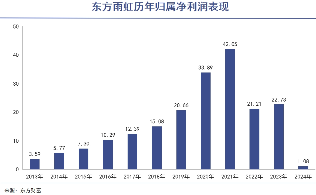 在此之前,受国内房地产深度调整影响,东方雨虹业绩重挫,2024年净利润仅剩1.08亿元,不到巅峰期2021年的3%。