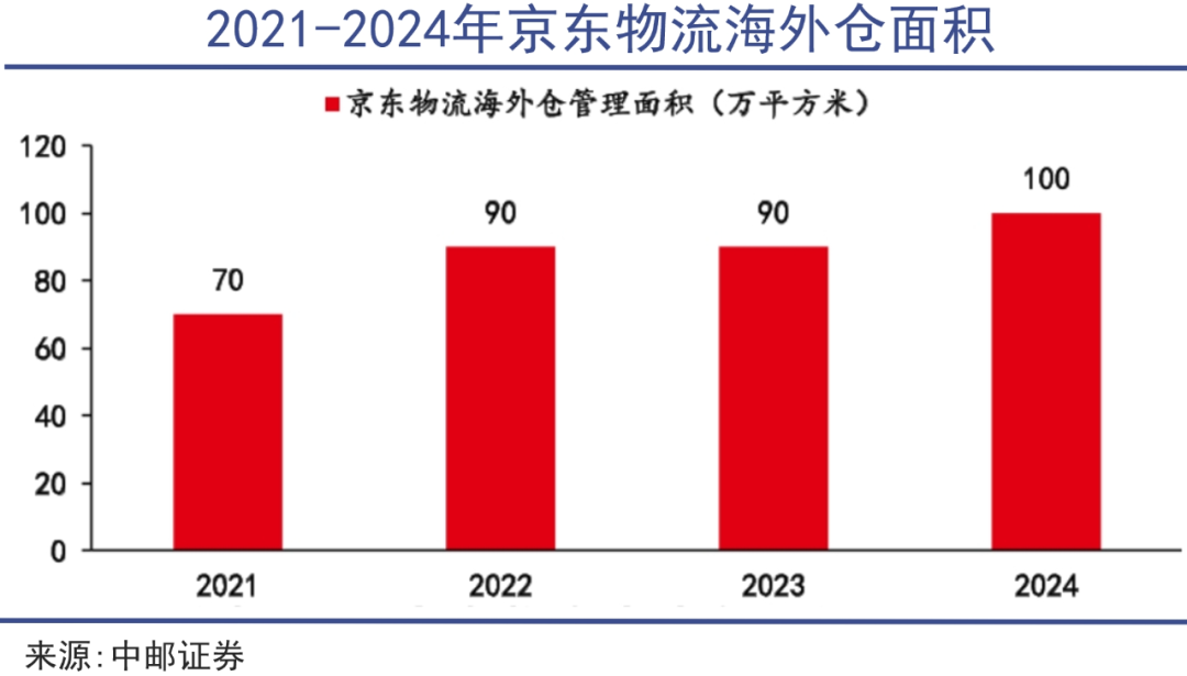 京东物流是集团征伐海外的利器,截至2024年底,京东物流拥有超100个保税仓库、直邮仓库和海外仓库,面积100万平方米。到2025年底,计划海外仓面积翻倍增长,覆盖全球4大洲、19国、超50个海外仓。